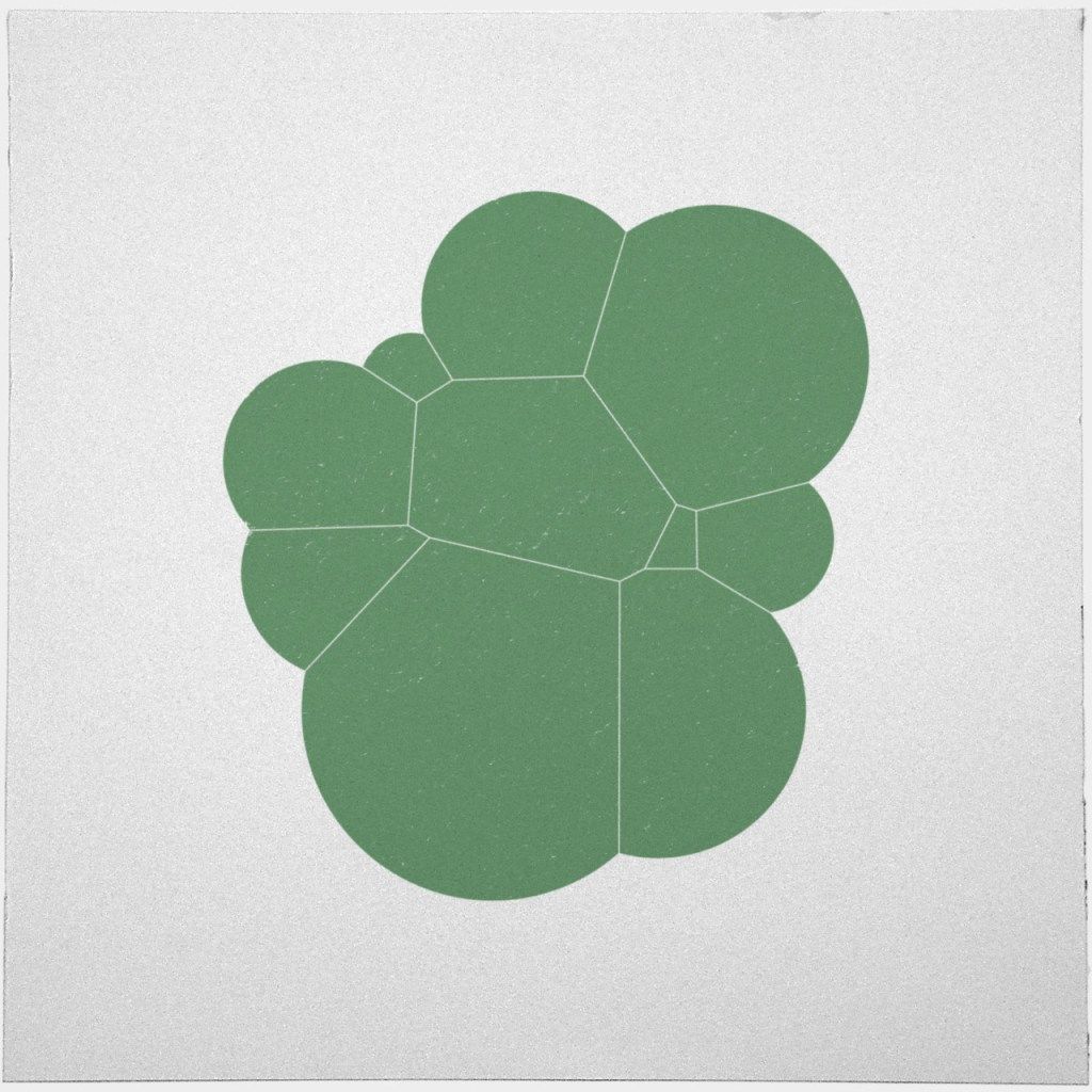 A minimalist geometric illustration featuring an abstract organic form composed of interconnected circular and rounded shapes in muted green tones. The design employs clean line work to define segmented sections, creating a cell-like or botanical structure against a neutral light gray background. The overall aesthetic is contemporary and calming, with a focus on geometric harmony and natural abstraction.