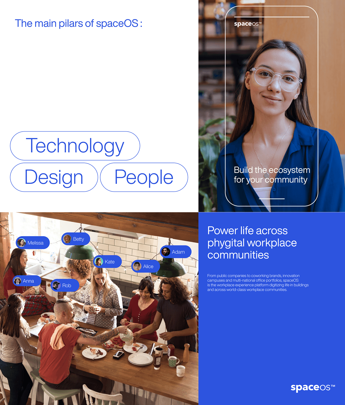 The image presents a clean, modern, and professional visual identity for a concept called spaceOS, using a bright white background contrasted with deep blues. The layout is divided into informational text blocks and a compelling portrait, suggesting a focus on technology, community building, and human capital.