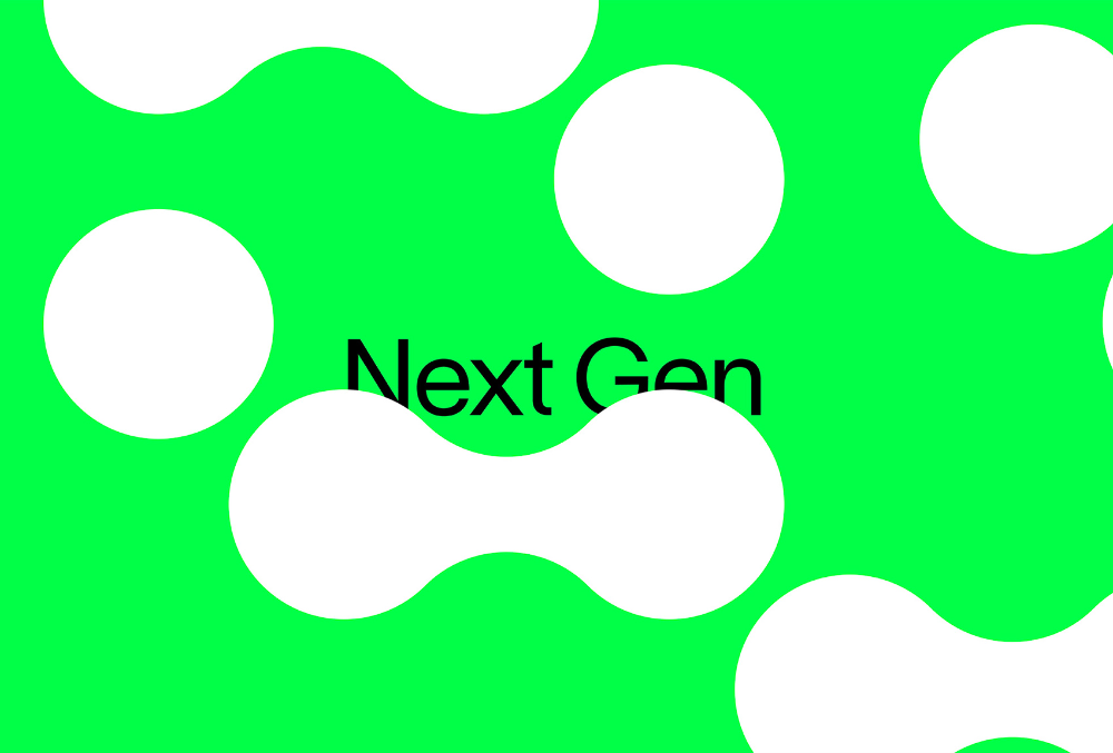 The image features a vibrant, high-contrast composition dominated by a bright lime green background punctuated by irregular white shapes. The design employs a playful, organic pattern that suggests movement and modern, youthful energy.