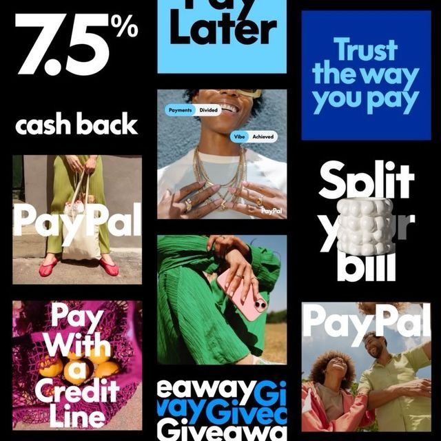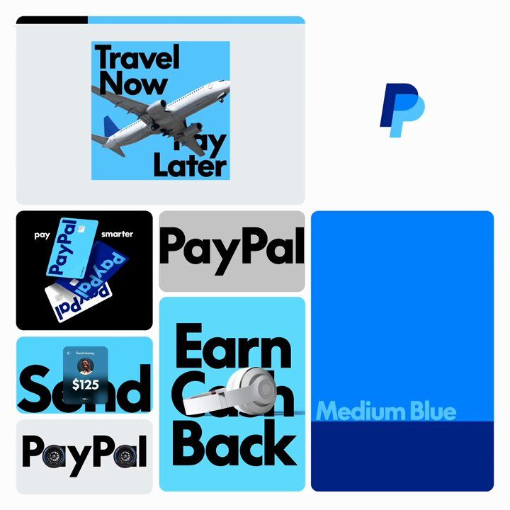 This image presents a modular collection of promotional graphics for PayPal services, utilizing a clean, flat design aesthetic common in fintech branding. The visual language relies heavily on cool blues and white space to convey trust, clarity, and accessibility for financial transactions. The layout is organized and segmented, making individual features easily digestible.