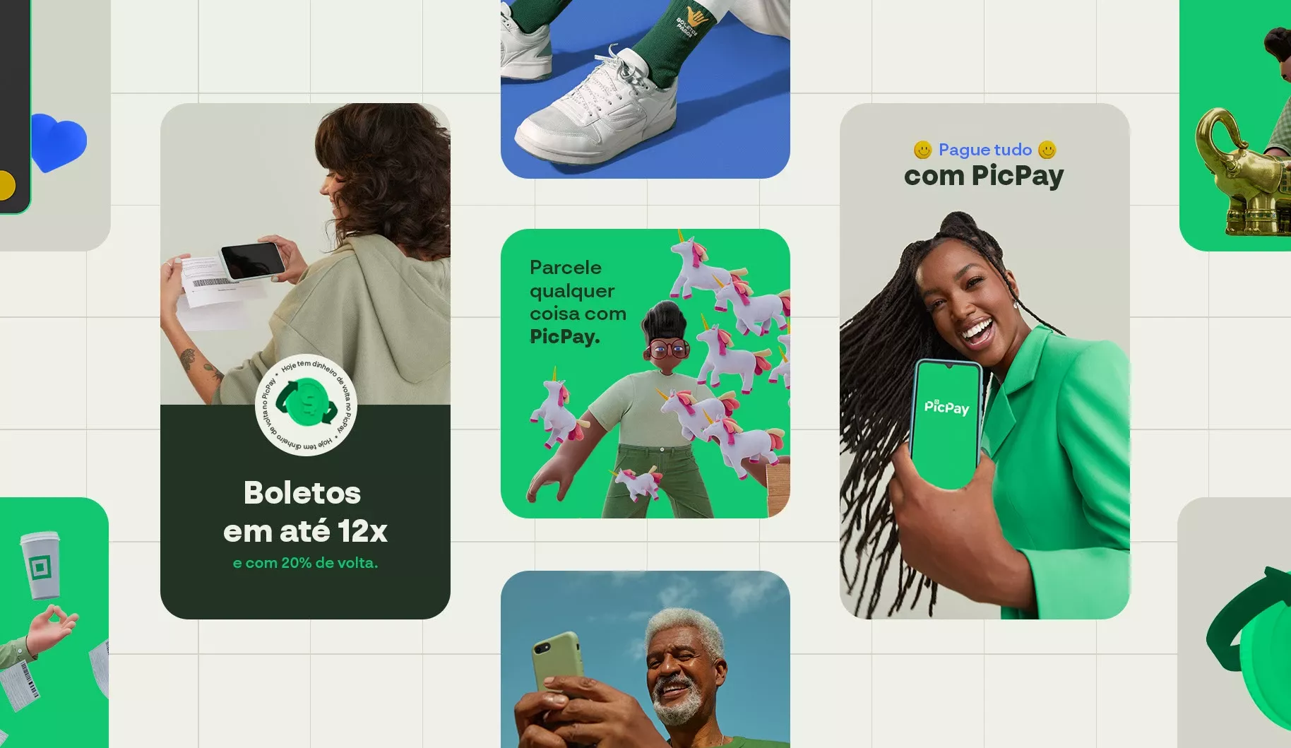 This visual features a clean, modern grid layout promoting financial services, utilizing bright pastel greens and white space to convey trust and accessibility. The design relies on clear iconography and lifestyle shots of users interacting with mobile technology to highlight ease of use.