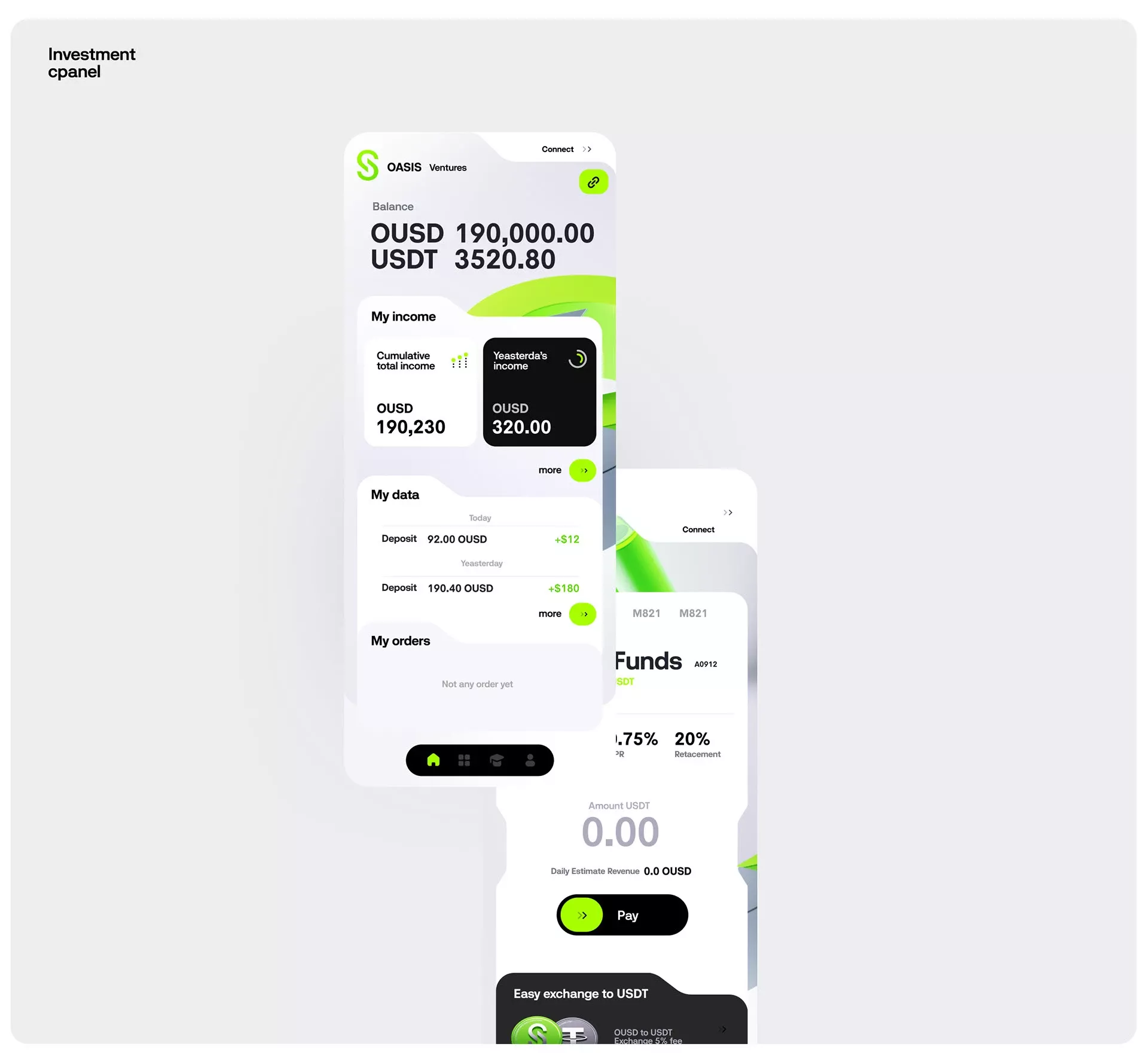 This is a highly structured promotional collage for a fintech mobile wallet service, emphasizing modern design and seamless digital transactions. The visual language is clean, utilizing strong geometric shapes and vibrant green accents to convey trust and accessibility.