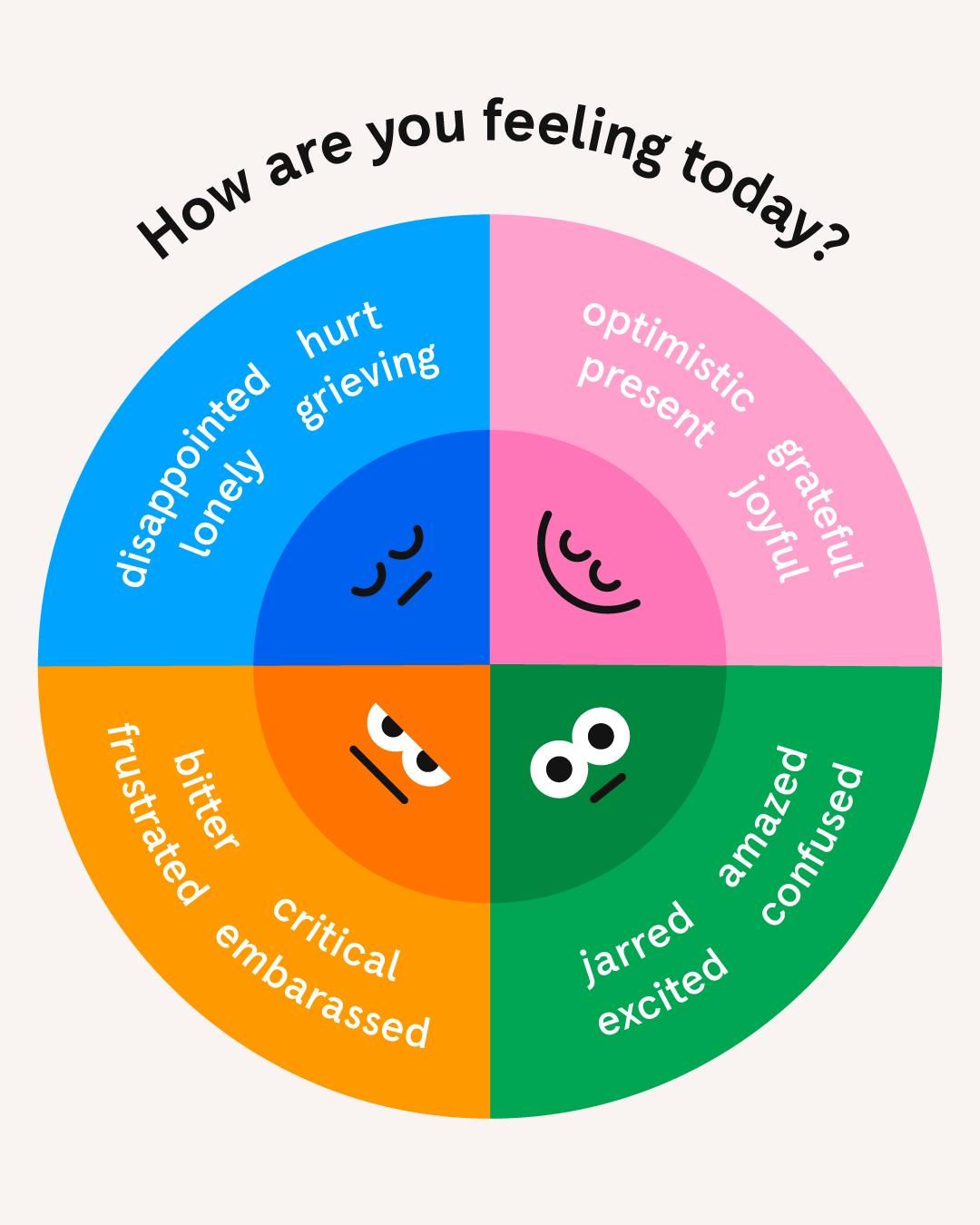 This is a vibrant, flat design infographic that uses a circular layout to map various emotional states. The visual language relies on distinct color segmentation to categorize complex feelings into easily digestible segments.