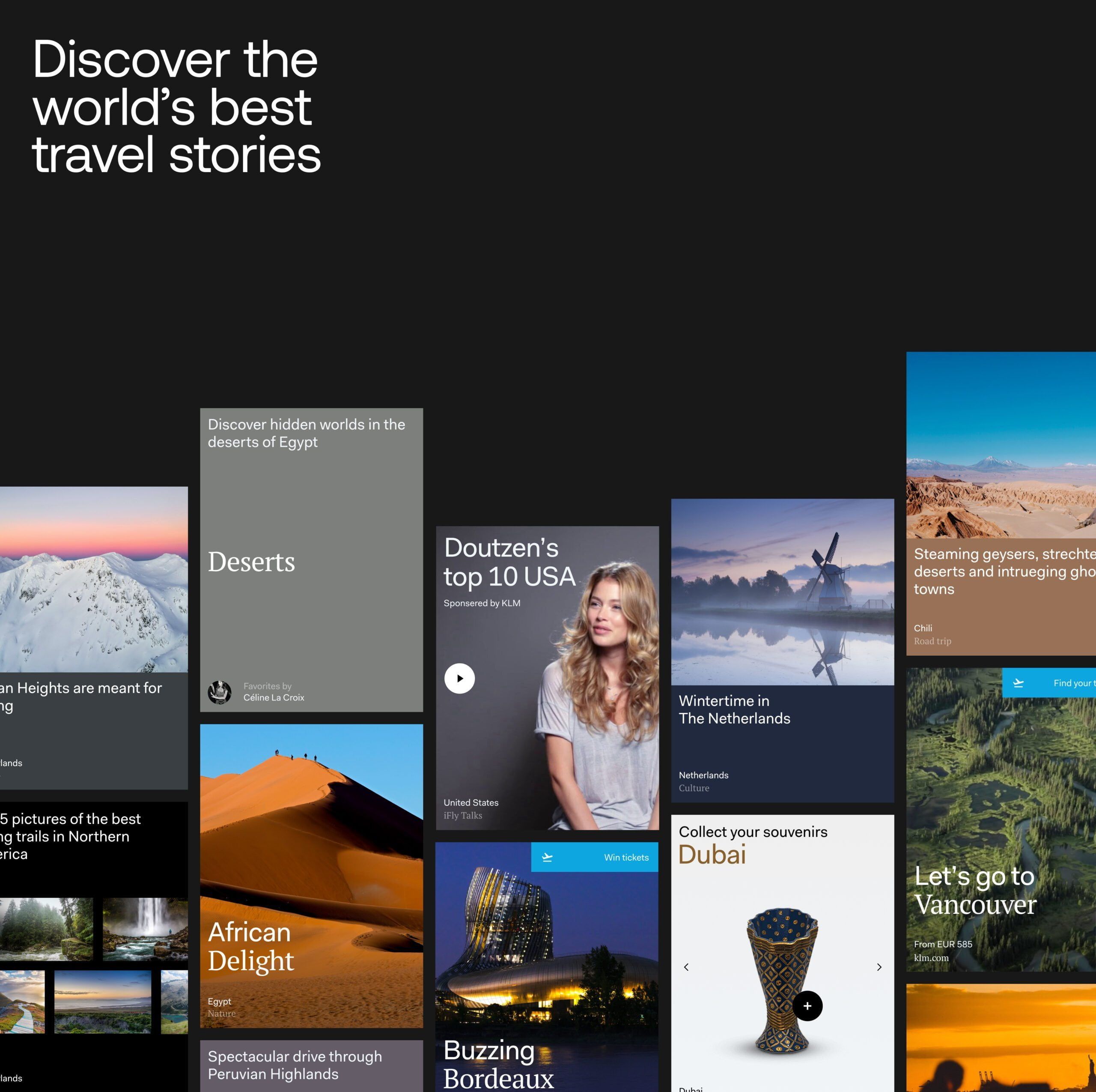 A dynamic travel discovery platform interface featuring a masonry grid layout of destination cards with evocative imagery and typography. The design combines photography, text overlays, and accent colors to create an engaging visual narrative around global travel experiences.