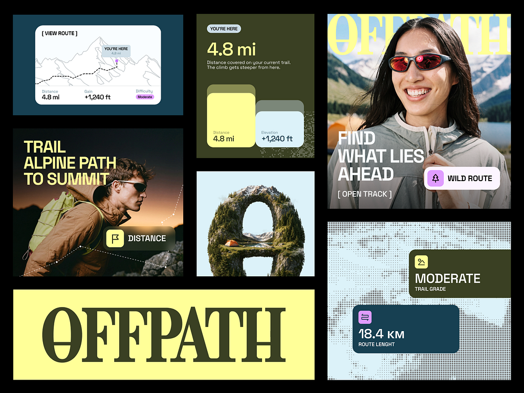 The image presents a modular, informational design typical of outdoor or hiking applications. It uses clean lines, high-contrast elements, and photographic imagery to convey adventure and route details effectively.