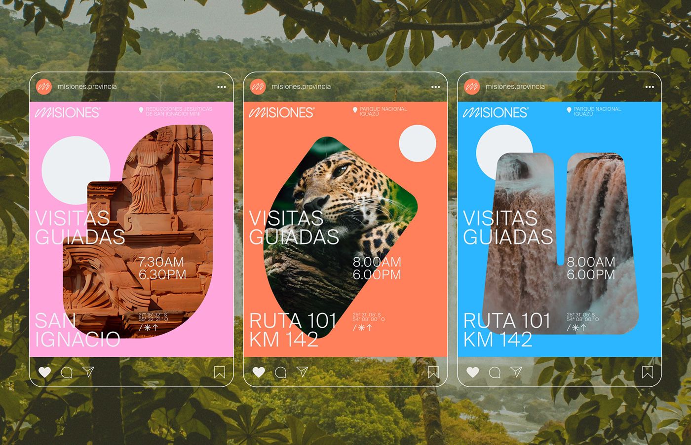 A vibrant triptych of social media cards promoting guided tours with bold, saturated color blocking and organic circular compositions. The design uses nature photography paired with geometric shapes and Spanish-language typography to create an energetic, contemporary travel marketing aesthetic.