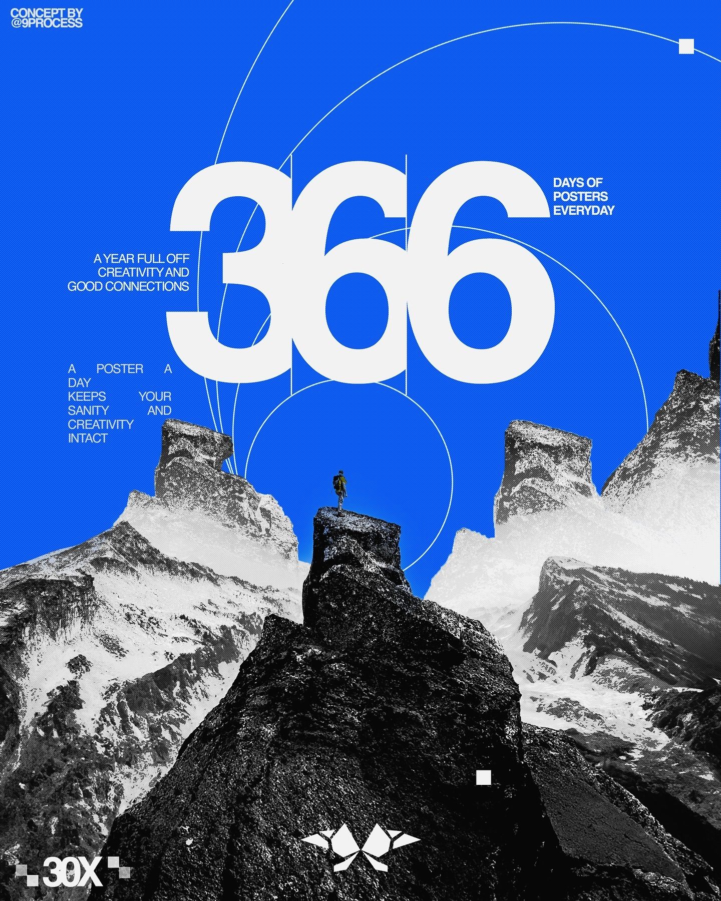 A bold Swiss-style design poster featuring the number 366 as the dominant typographic element, overlaid on a dramatic black and white mountain landscape photograph. The composition merges modernist graphic design principles with nature imagery, creating a striking contrast between geometric abstraction and organic forms against a vibrant electric blue background.