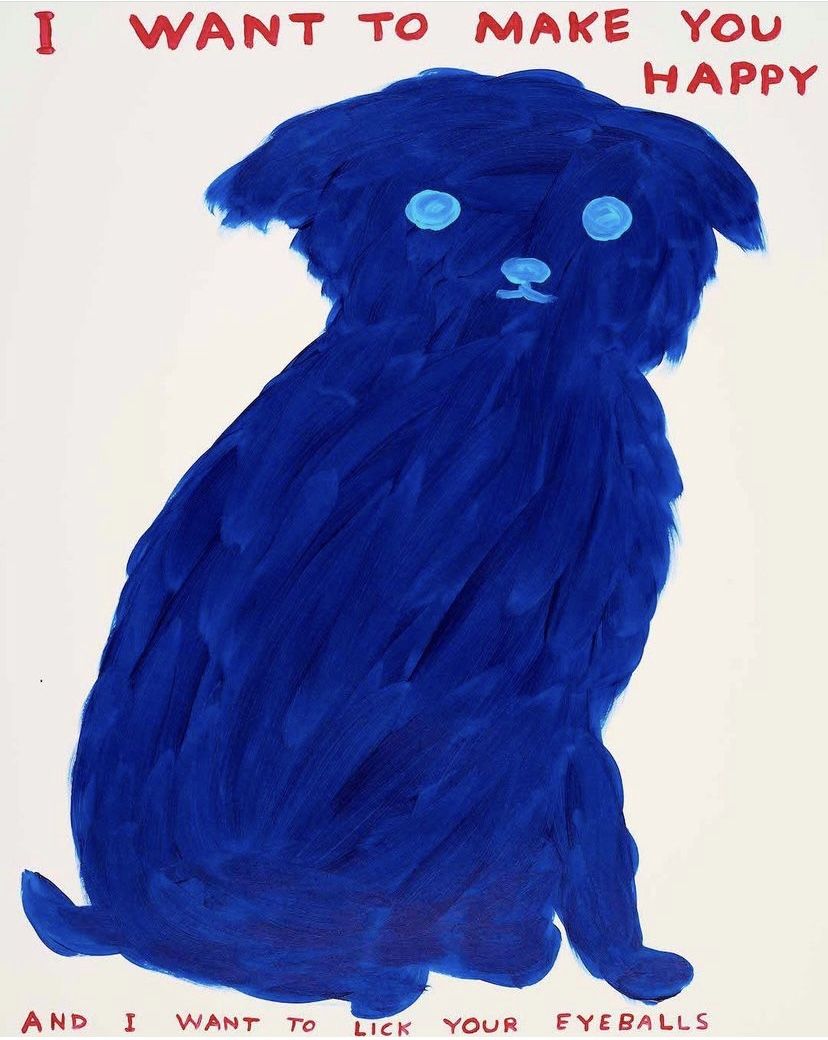 This is an expressive illustration featuring a deeply saturated blue dog rendered with visible, textured brushstrokes. The design combines whimsical subject matter with playful, slightly suggestive text to create a bold and affectionate tone.