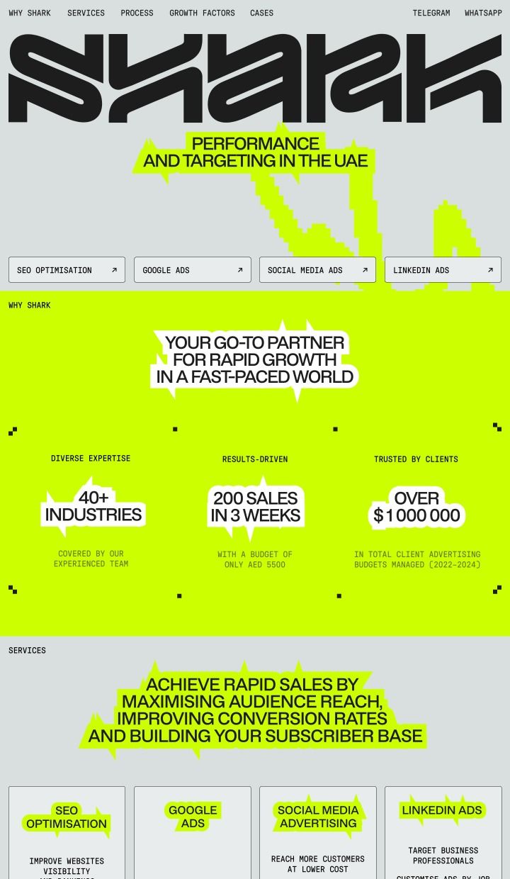 This graphic utilizes a high-contrast, modern visual language characterized by bold typography and strong geometric divisions. The design is clean and structured, effectively conveying expertise and performance through a clear hierarchy of services and impressive statistics.
