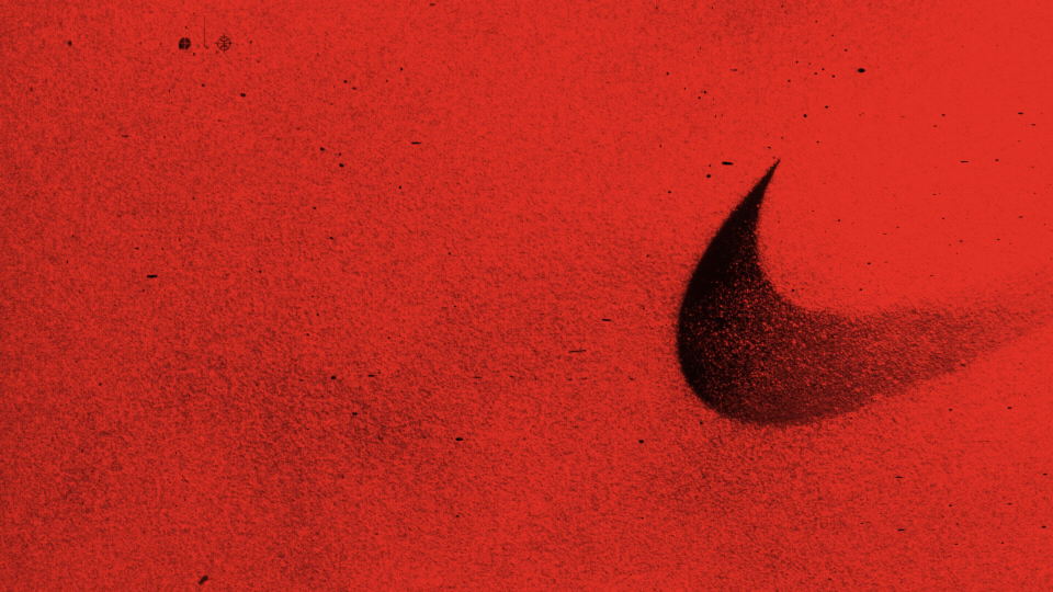 This is a high-contrast, minimalist graphic utilizing a warm, intense red field juxtaposed with a stark black athletic symbol. The image features significant texture or grain, lending a raw, distressed, and bold aesthetic to the composition.