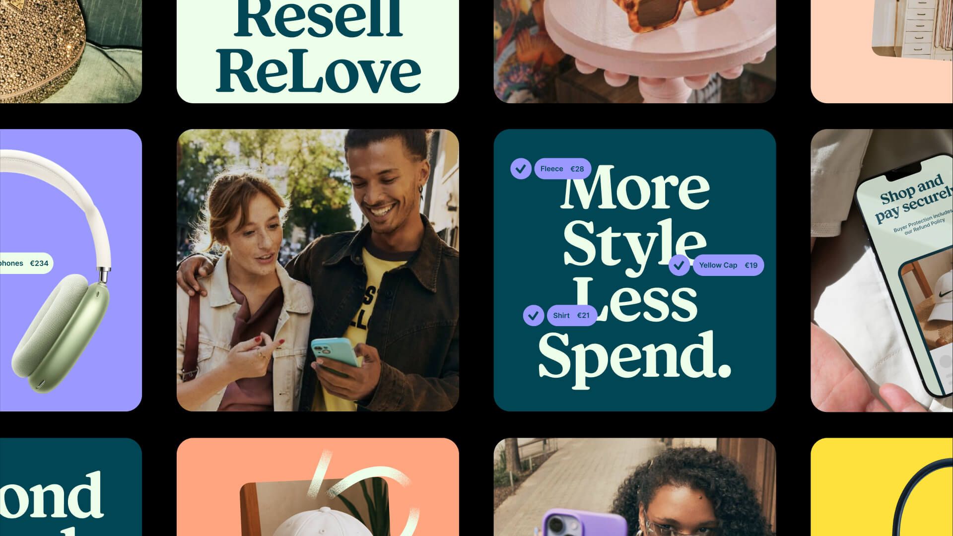 The image presents a clean, modern grid of visual tiles designed for digital advertising or branding. The design utilizes bright pops of color against muted backgrounds, creating a visually engaging and organized layout typical of lifestyle and e-commerce platforms.