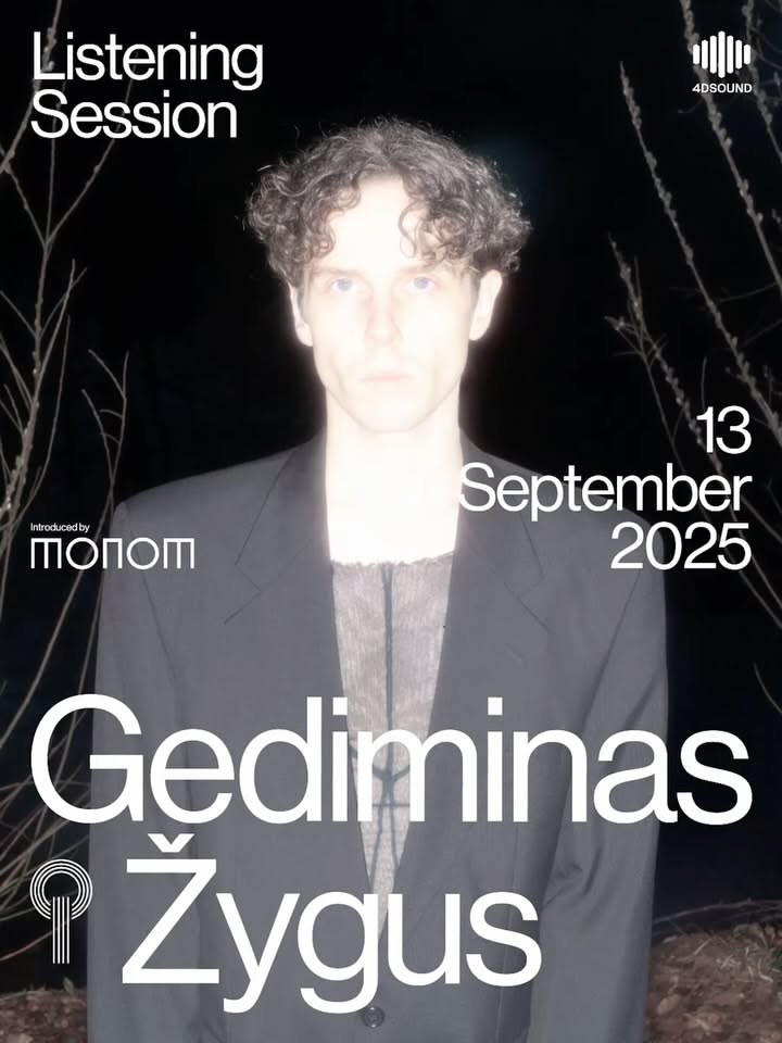 A contemporary music event poster featuring a minimalist aesthetic with a haunting portrait of the featured artist against a dark background. The design combines modern typography with atmospheric photography, creating an intimate and sophisticated promotional material for an electronic music listening session.