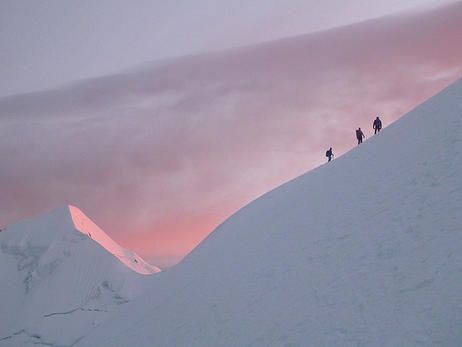 This image captures a dramatic, high-altitude landscape dominated by stark white snow and a vibrant pink/rose sky at what appears to be sunrise or sunset. The composition emphasizes the vastness of the environment and the small scale of the figures against the immense natural backdrop.