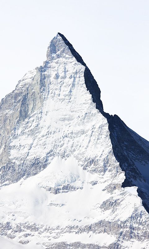 This image captures the dramatic scale and rugged texture of a mountain peak, employing high contrast between brilliant white snow and deep shadow. The visual language is stark and minimalist, focusing entirely on the geological form and the interplay of light and dark.