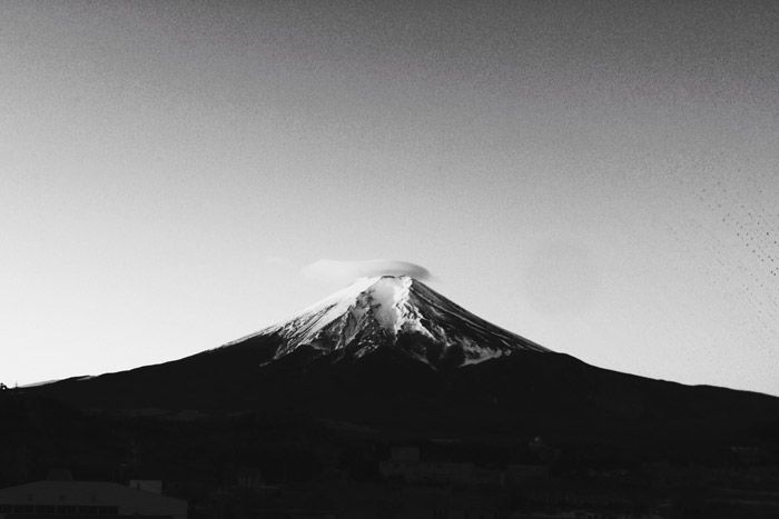 This image employs a stark, minimalist visual language, utilizing high contrast to emphasize the majestic silhouette of Mount Fuji against an expansive sky. The composition is centered and symmetrical, drawing immediate attention to the iconic peak and the dramatic interplay between light and shadow.