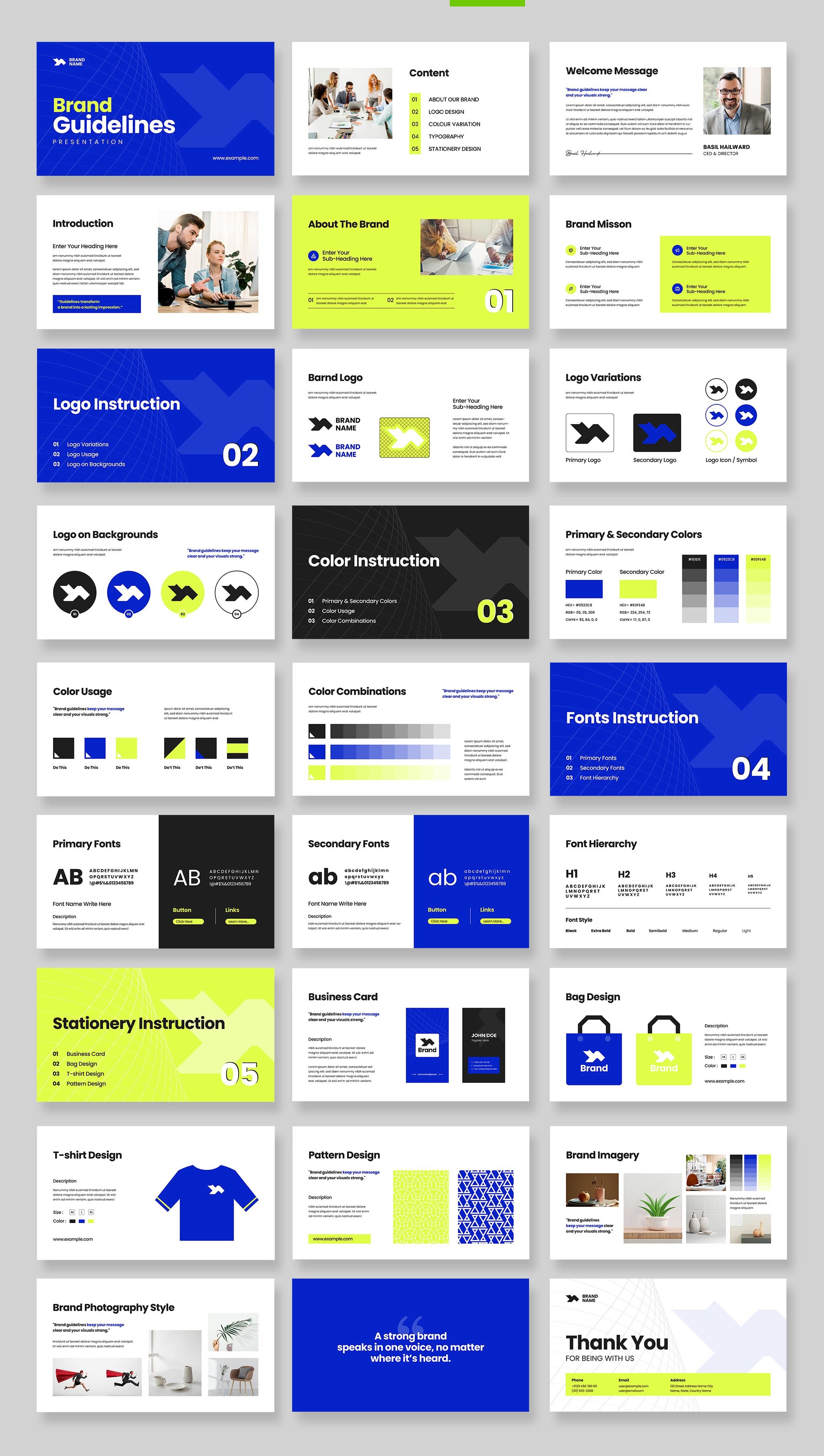 This deck features a highly structured and professional design language, utilizing a clean, modular layout to present detailed brand guidelines. The visual language is modern and corporate, emphasizing clarity through strong hierarchy and consistent use of color blocking.