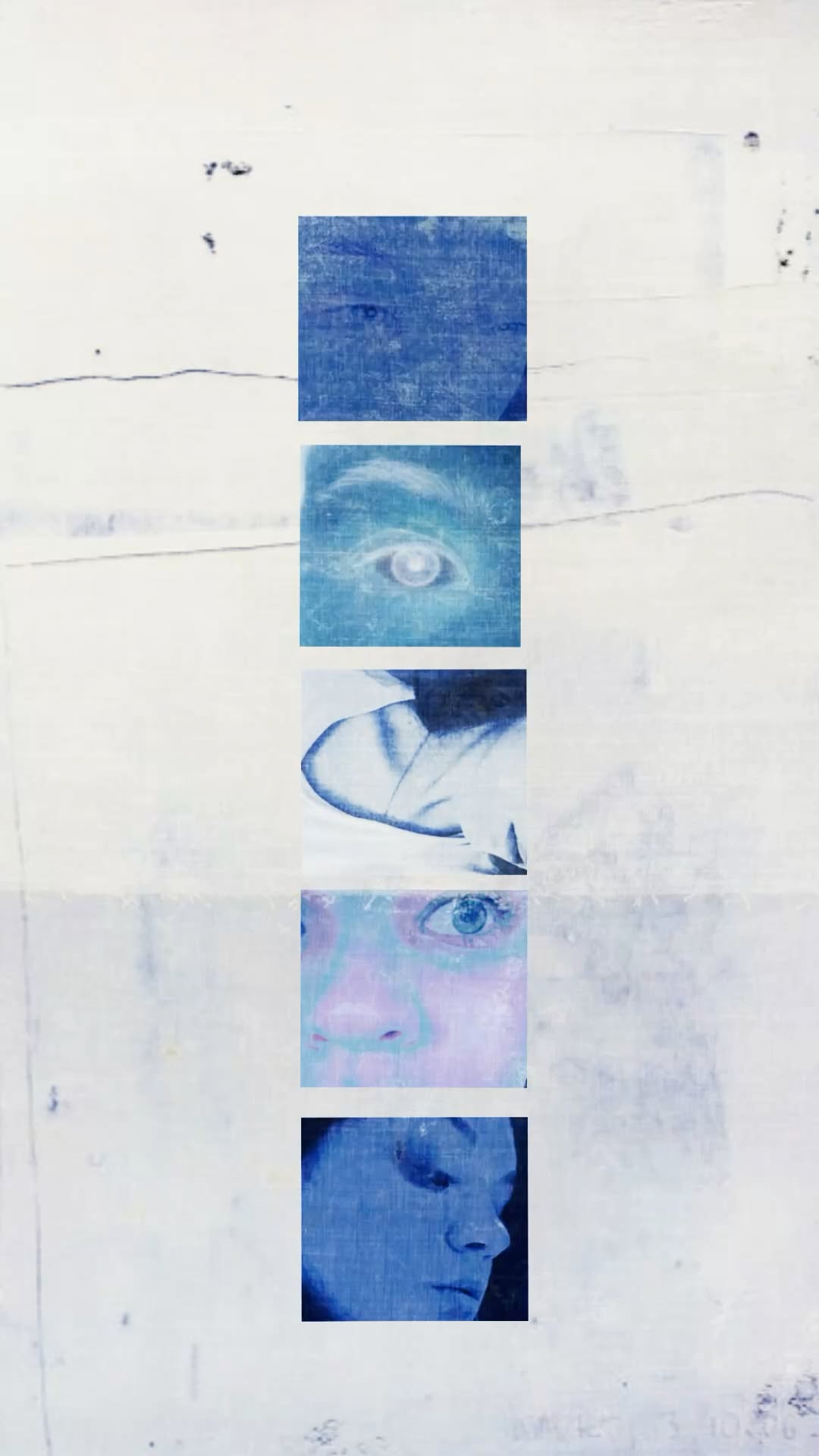 This is a vertical, minimalist abstract composition featuring a series of stacked, rectangular forms that resemble stylized eyes or facial features. The design employs a limited, cool color palette and strong geometric repetition to create a sense of introspection and subtle surrealism.