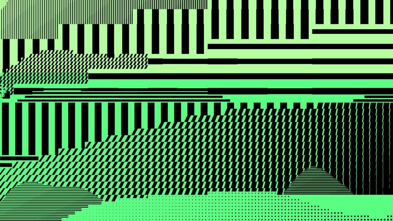 This abstract graphic utilizes a stark, high-contrast palette of black and various shades of green to create a dynamic, textured surface reminiscent of data visualization or digital noise. The composition is characterized by strong vertical and horizontal lines, suggesting rhythm and structured chaos.