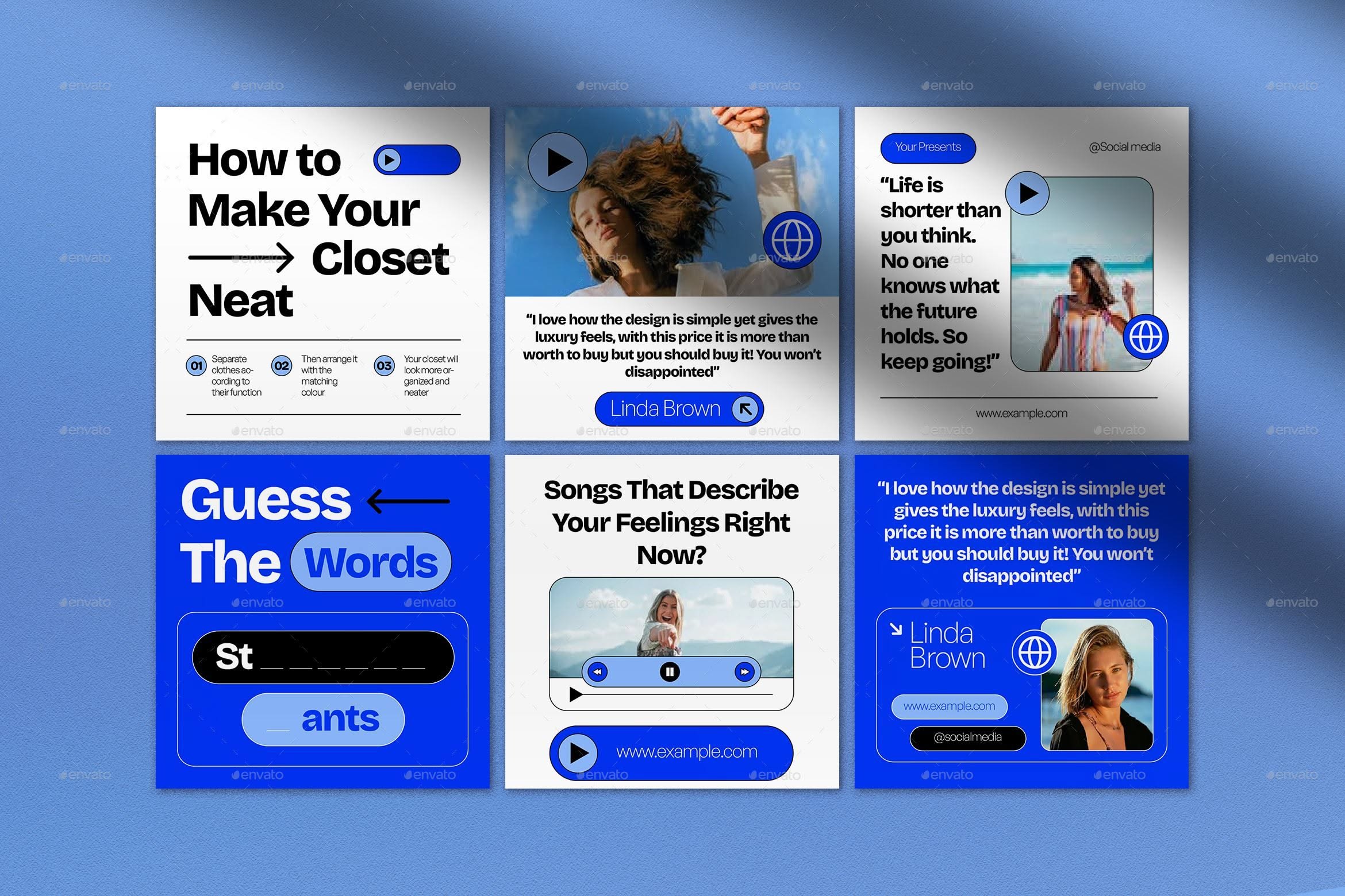 A modern social media feed layout showcasing a series of card-based posts with mixed content including statistics, photography, and typography-driven messaging. The design employs a clean, minimalist aesthetic with generous whitespace and a contemporary color palette that balances vibrant accent colors against neutral backgrounds.