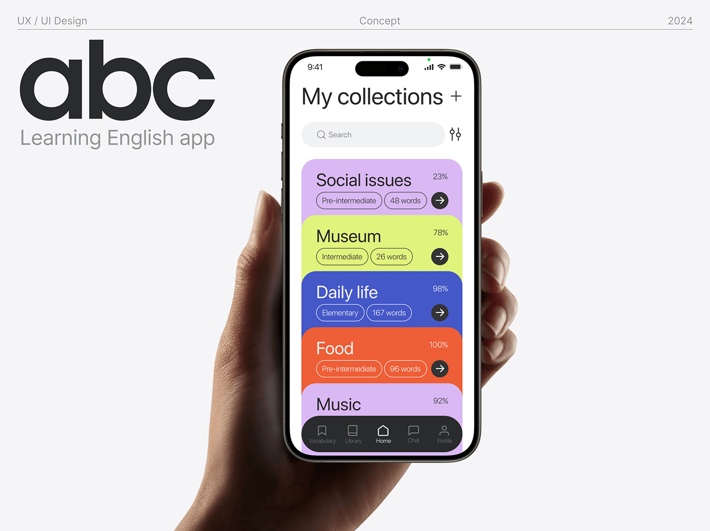 This design showcases a clean, modern mobile interface for an educational application, utilizing clear visual hierarchy to present categorized learning content. The layout is highly organized, employing distinct color blocks and ample white space to ensure readability and intuitive navigation for users.