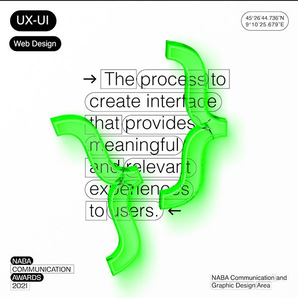 This graphic illustrates a conceptual process flow related to UX/UI design, utilizing a fluid, organic shape that suggests creation and relevance. The visual language is clean and modern, employing a vibrant glow effect to emphasize the movement and importance of the design journey.