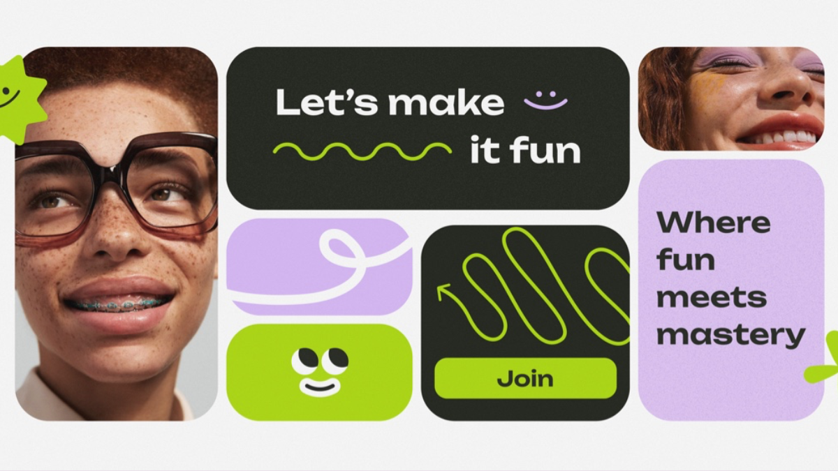 This design utilizes a clean, modular layout with soft rounded shapes to create an inviting and modern aesthetic. The visual language balances playful elements, such as wavy lines and bright colors, with professional typography to suggest a fun yet mastery-focused learning environment.