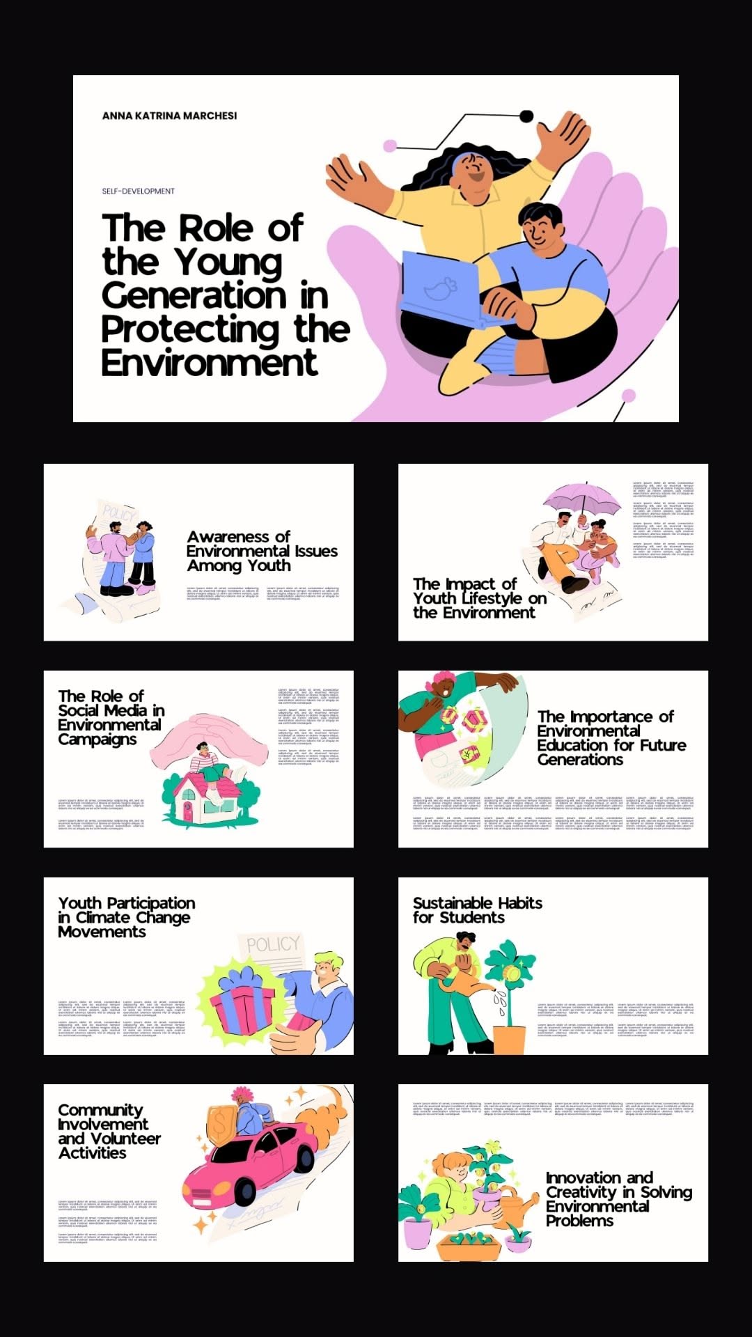 This visual collection uses a friendly, modern illustration style to present various topics related to environmental protection and youth engagement. The design is clean and modular, utilizing soft colors and engaging characters to make complex themes accessible and appealing to a younger audience. The overall feel is positive, educational, and action-oriented.