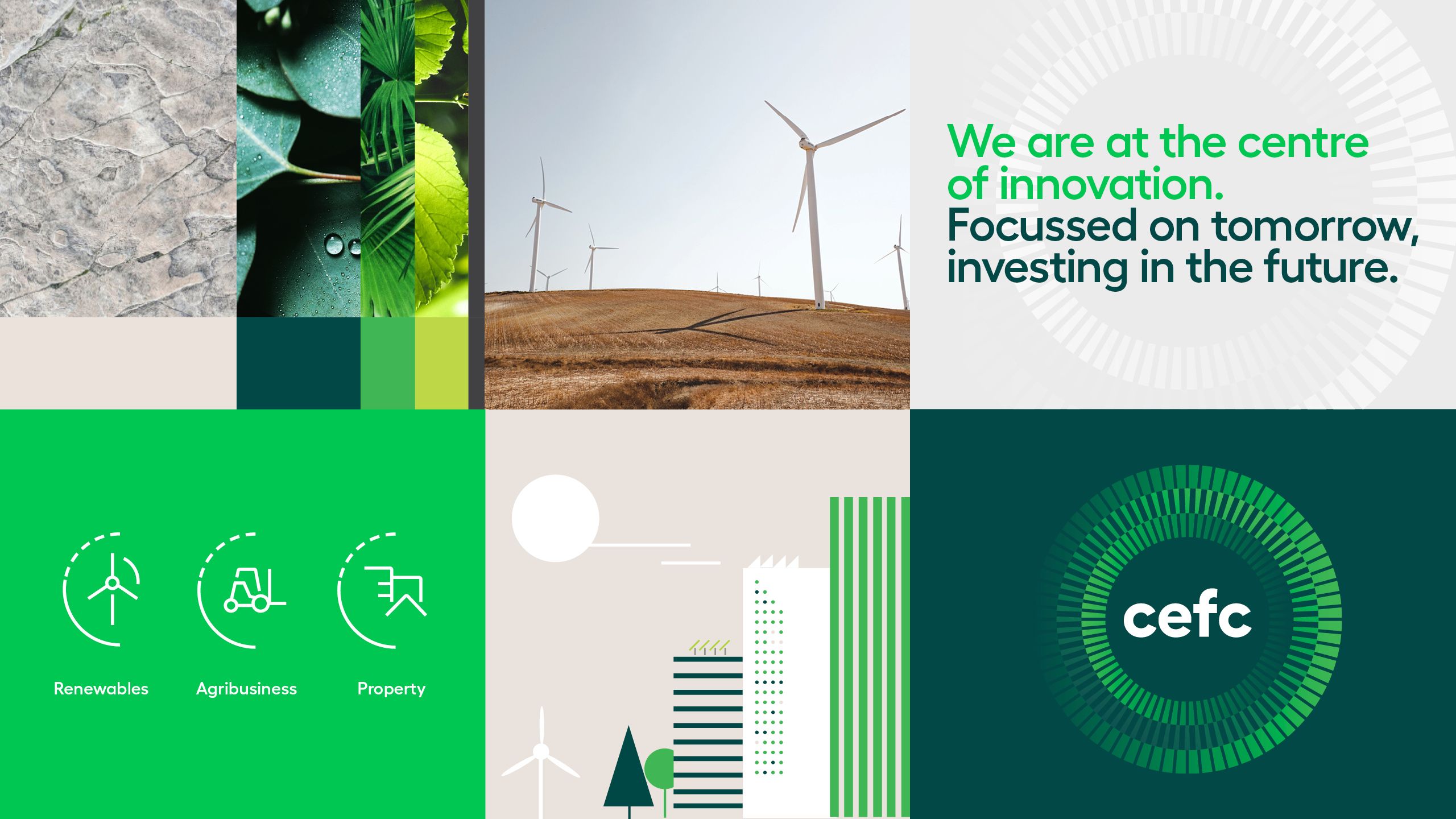 A modern corporate presentation combining sustainability imagery with clean geometric layouts and vibrant green accents. The design integrates environmental themes—wind turbines, natural textures, and vegetation—with contemporary business iconography and a bold circular logo system. The visual language emphasizes innovation, sustainability, and forward-thinking corporate values through strategic color blocking and minimalist composition.