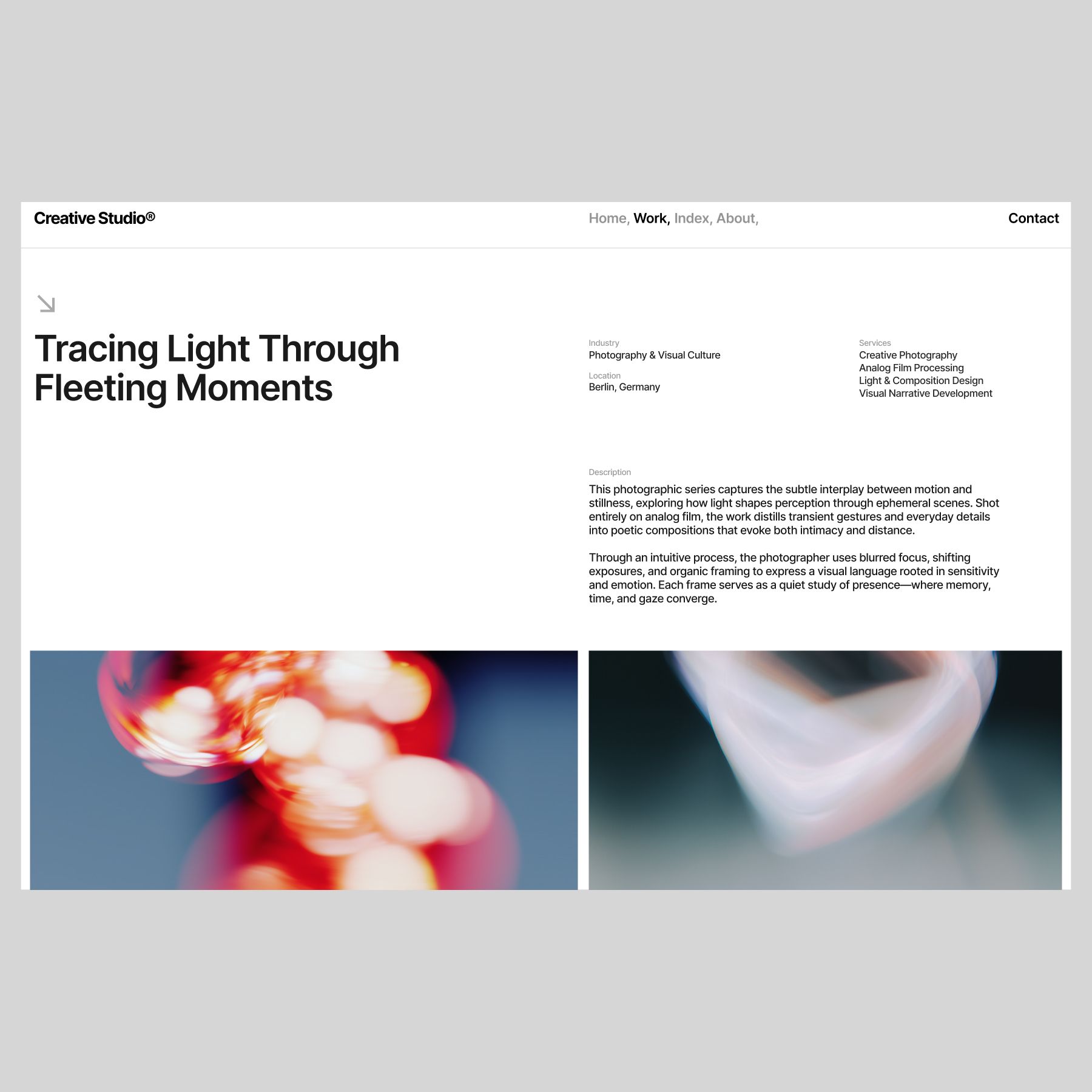 The design is clean, minimalist, and professional, utilizing ample white space to focus attention on the photographic examples. The layout is structured with clear navigation and prominent visual content, conveying a sophisticated and artistic portfolio feel.