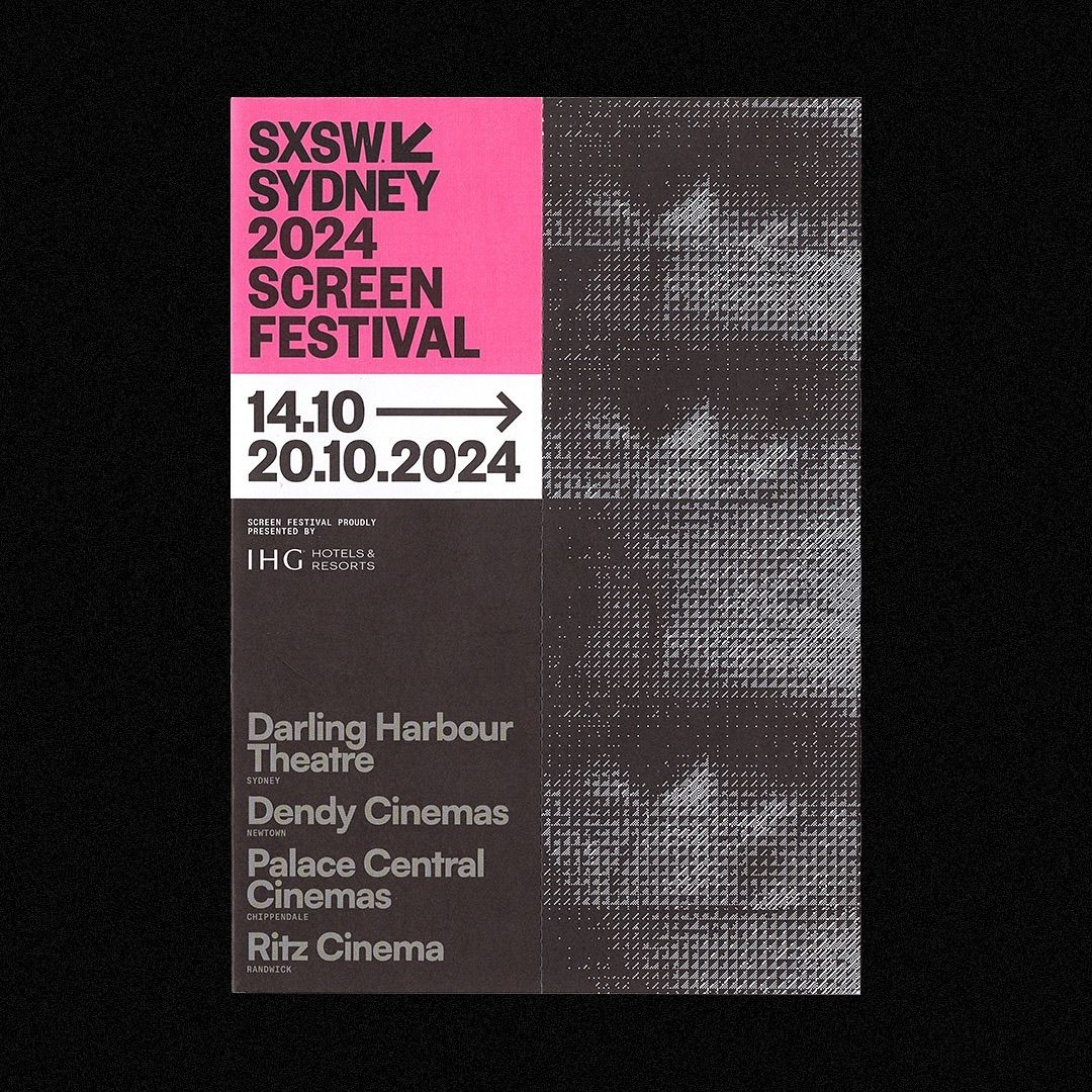 The poster employs a stark, high-contrast design using a limited palette of black, white, and a vibrant magenta/pink for key information. The layout is clean and hierarchical, using strong typography to clearly delineate the event details and venue names against a textured, dark background.