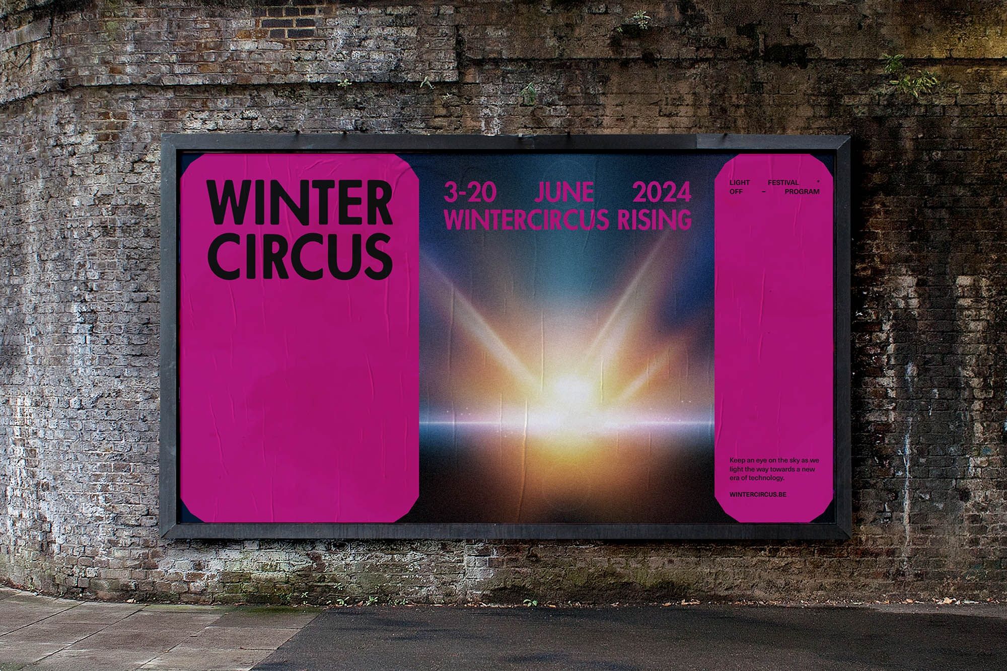 This design utilizes high contrast and bold color blocking to create a dramatic and theatrical visual identity for an event. The vibrant magenta background combined with a bright central light effect immediately draws the viewer's eye, establishing an exciting and immersive atmosphere.