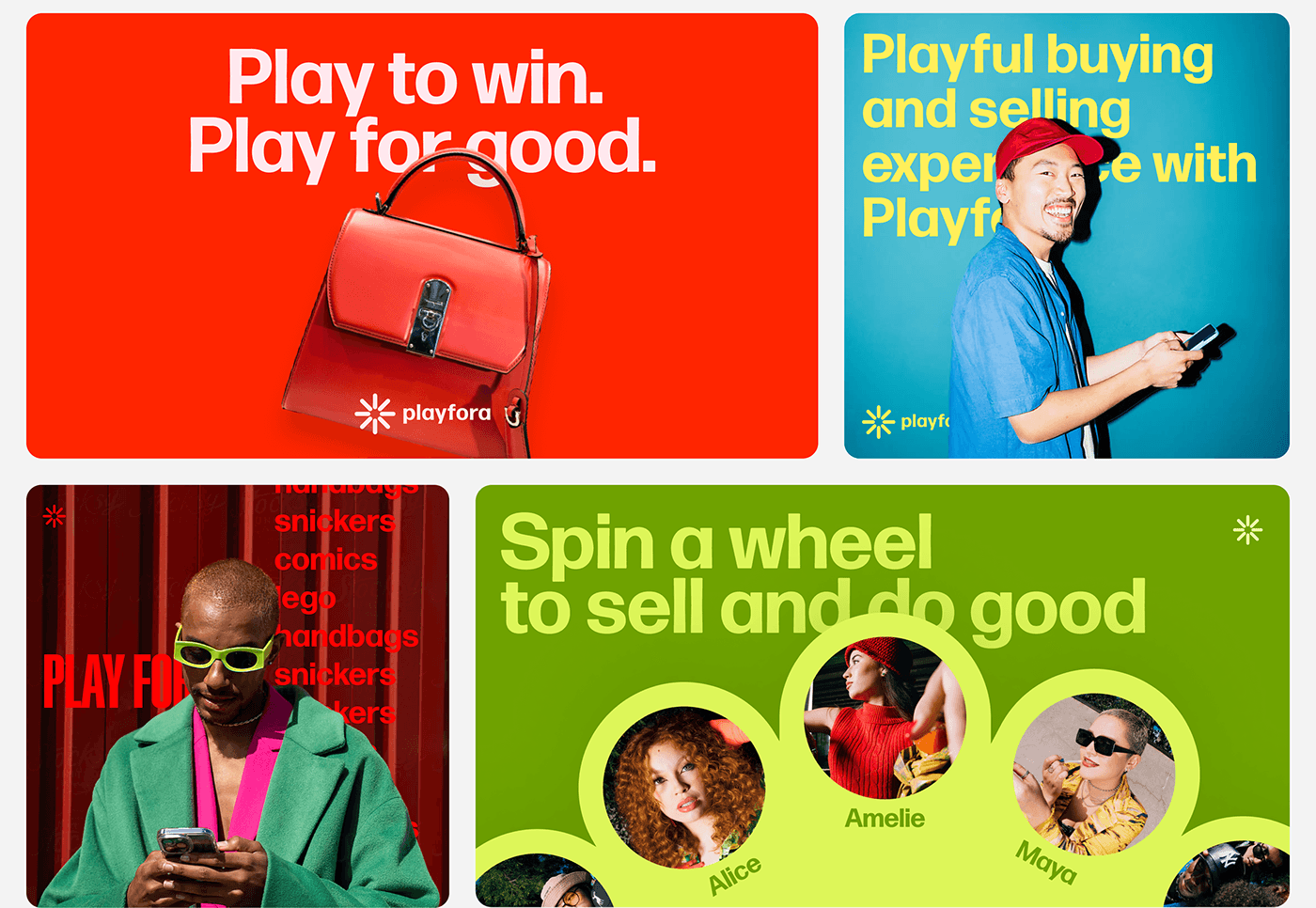 This image features a vibrant, high-contrast graphic design using bold blocks of color to promote different aspects of a platform. The visual language is clean and direct, employing clear calls to action and appealing imagery to convey a positive and engaging user experience.