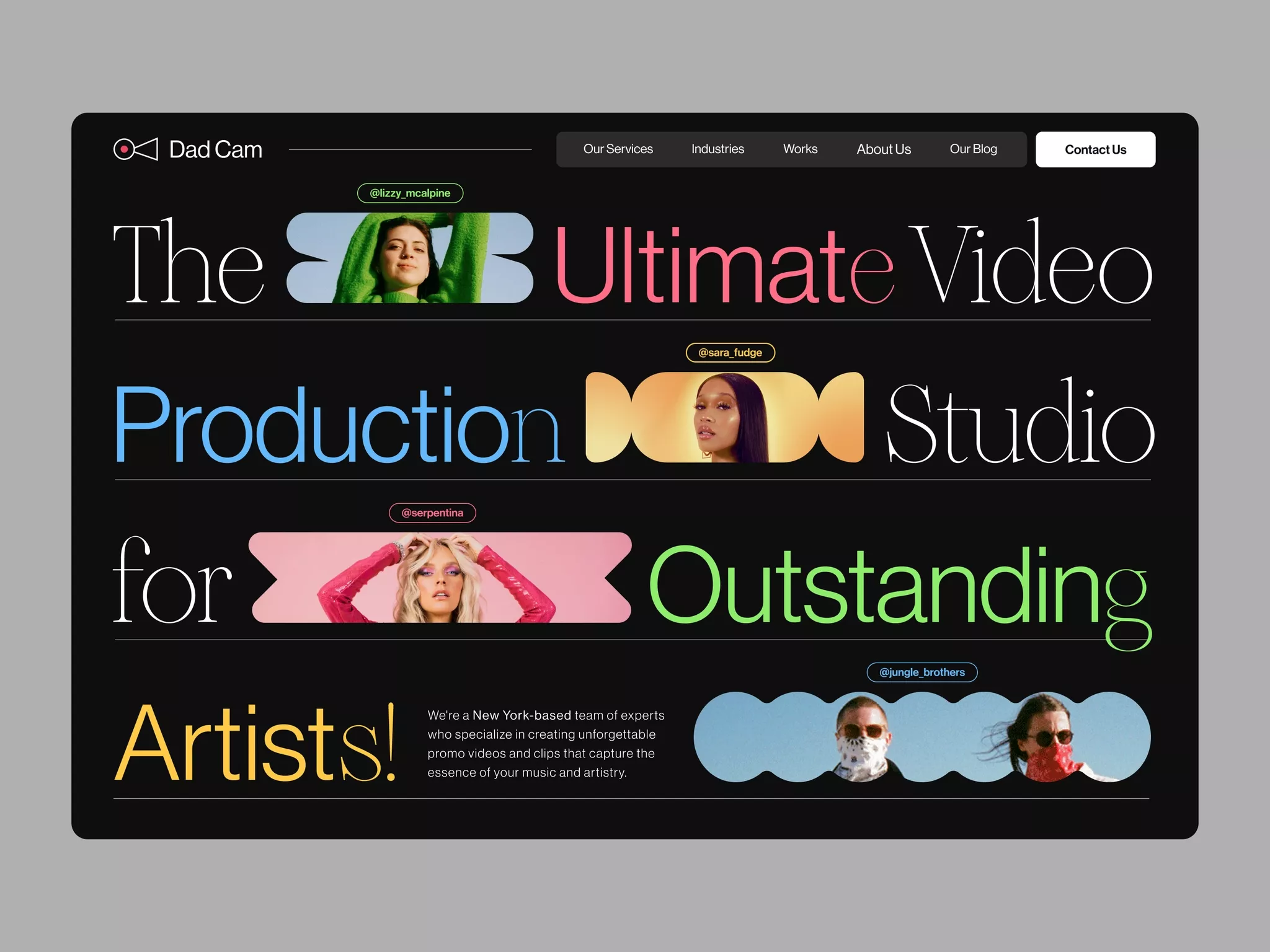 The design is modern and professional, utilizing a dark background with bright, contrasting accent colors to highlight key text. It employs clean lines and high-quality photography to convey a sense of expertise and creative production.