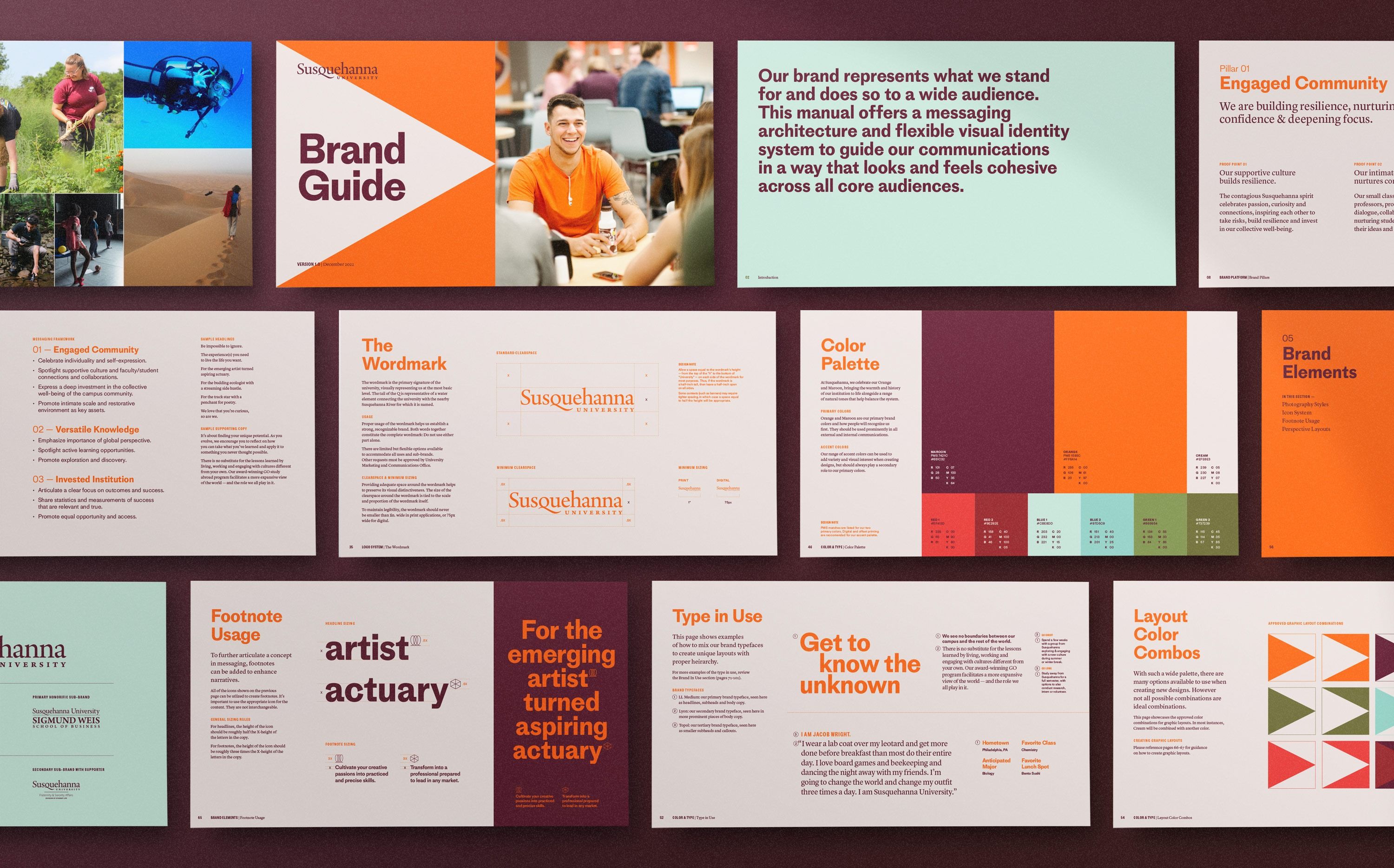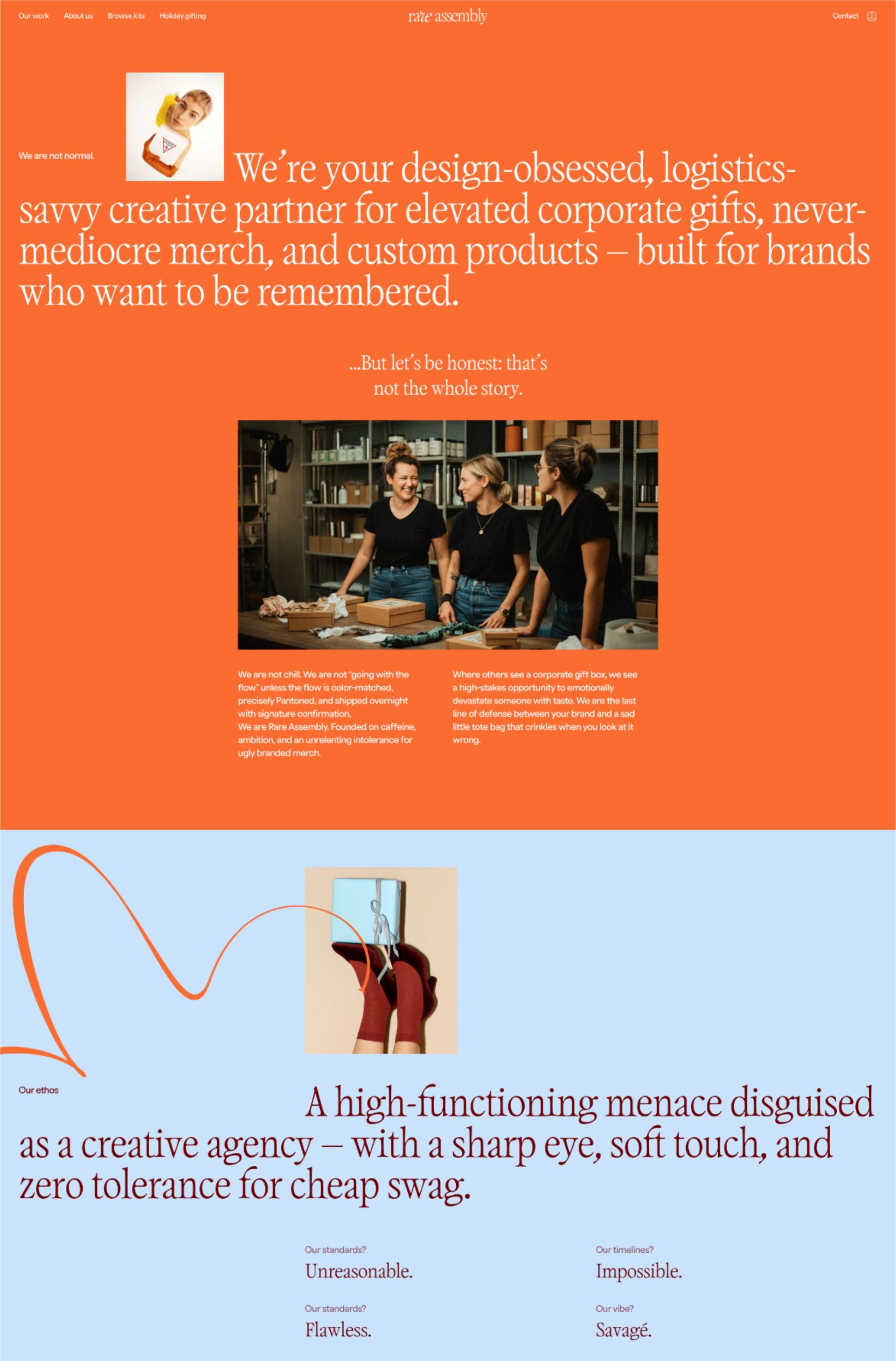 The design is modern, clean, and professional, utilizing a strong contrast between warm orange tones and muted blues/grays. The layout is structured with clear sections, employing high-quality photography to convey a sense of expertise and bespoke service.