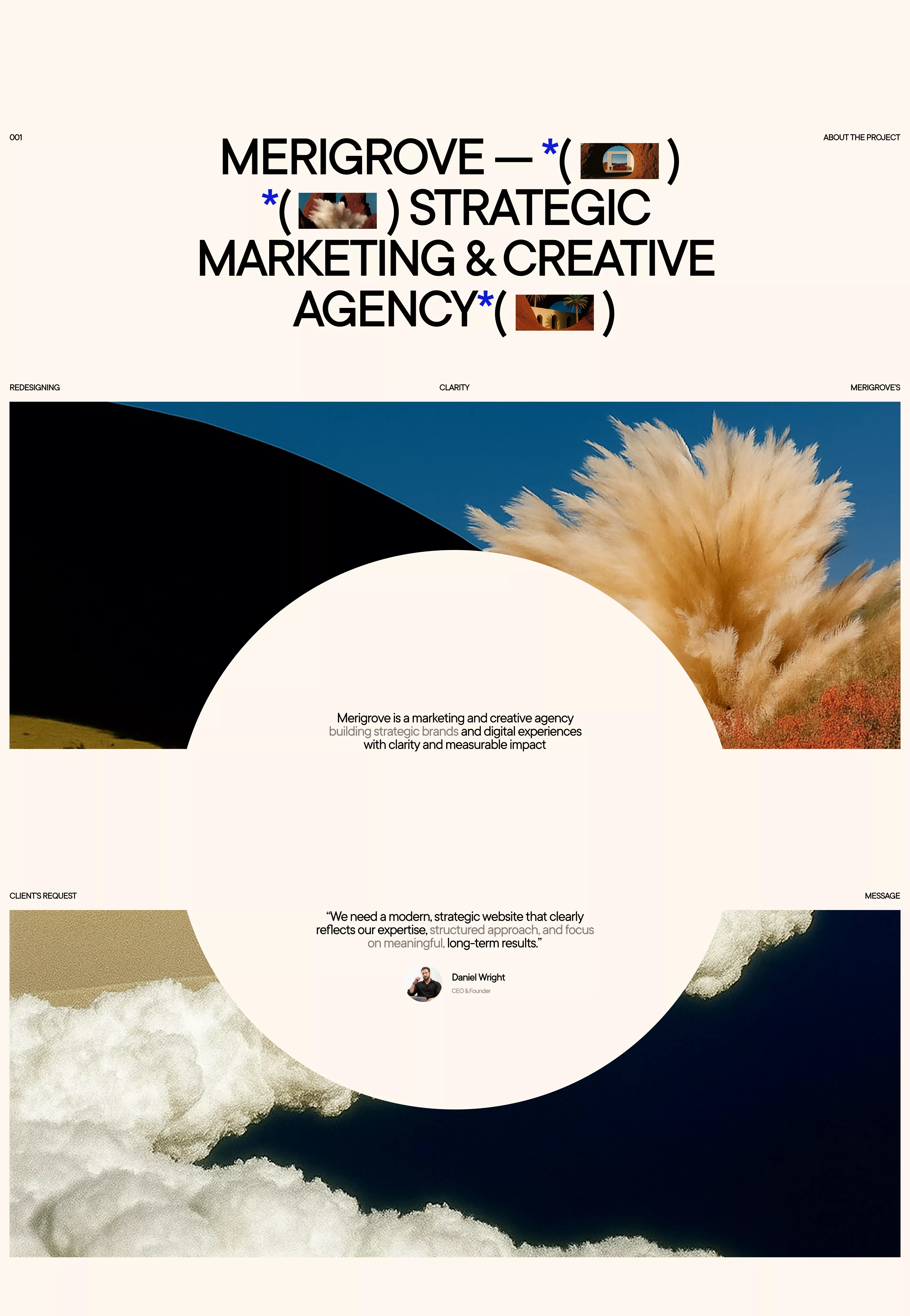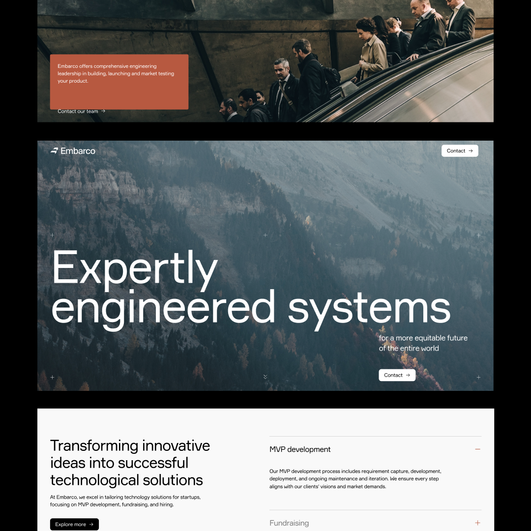 The design exhibits a highly professional and modern aesthetic, utilizing high contrast and ample white space to convey expertise. The visual language is clean and structured, effectively guiding the user through a clear hierarchy of information, emphasizing trust and competence.