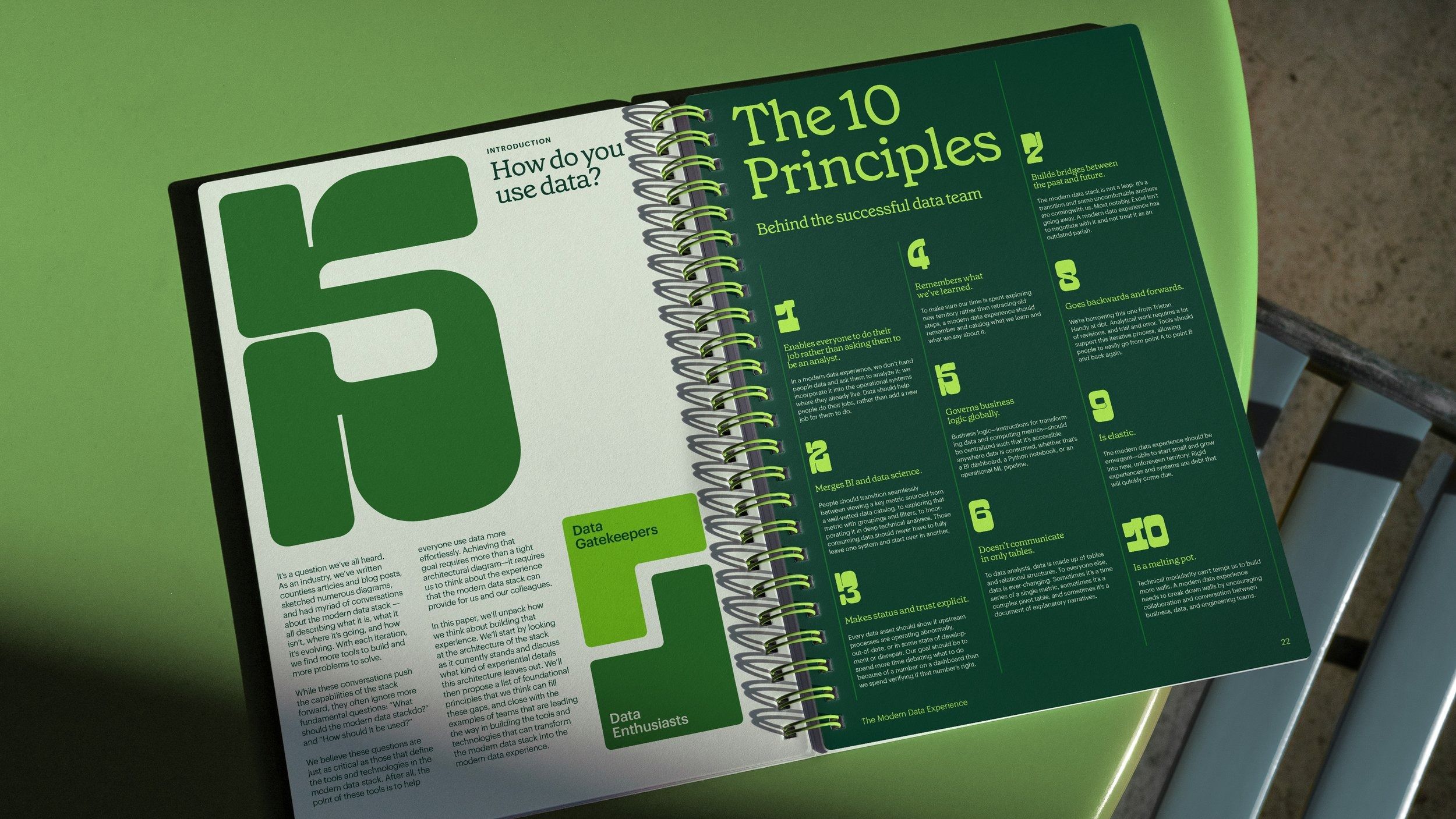 The image displays a professional, organized presentation or guide, likely a booklet or notebook section, characterized by a clean, modern aesthetic. It uses a strong contrast between white space and deep green accents to convey structure and expertise.