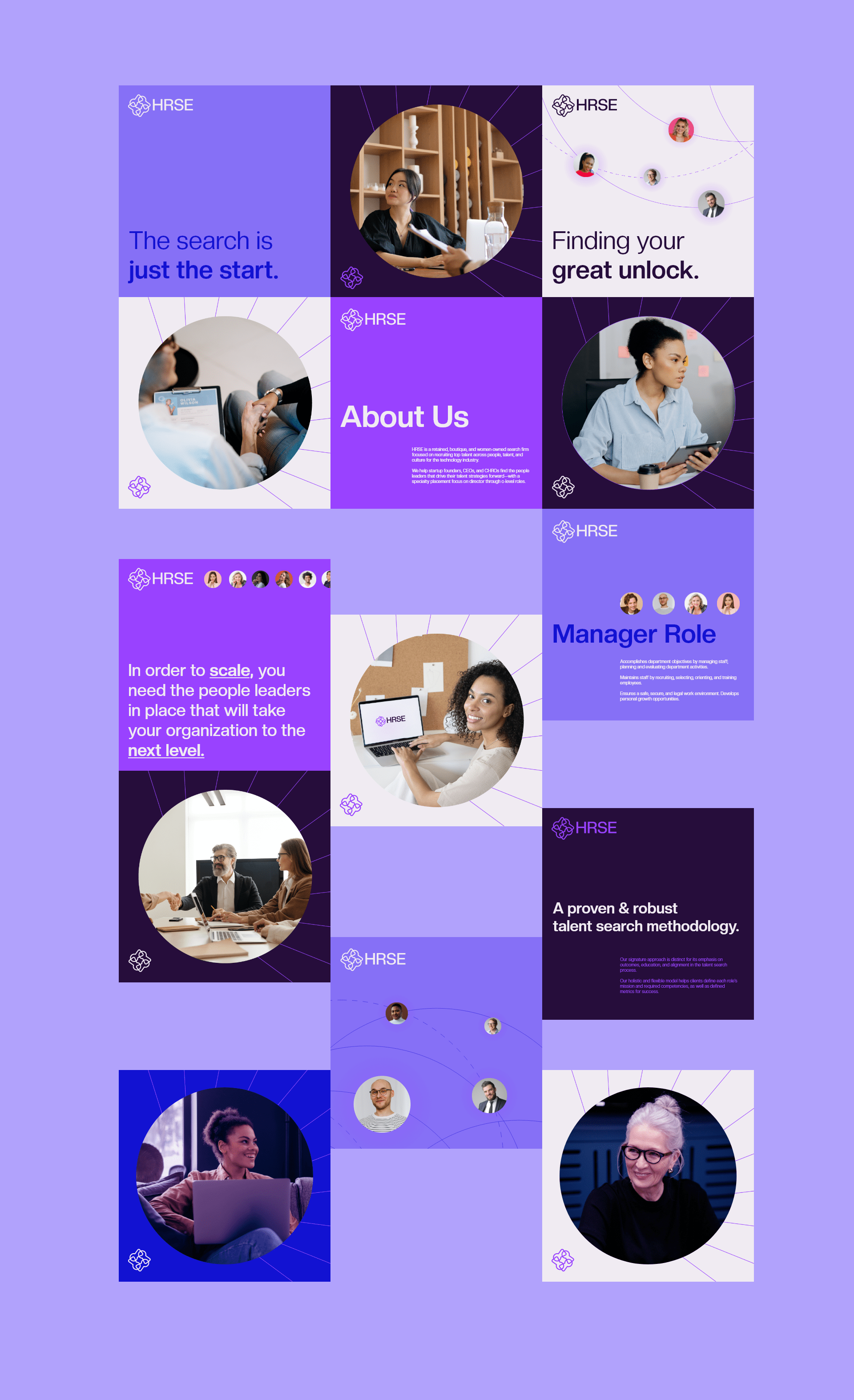 The image presents a clean, professional, and modern visual identity, likely for a consulting or HR service. It uses a consistent grid layout with circular photographic elements set against a soft purple background, conveying trust and expertise.