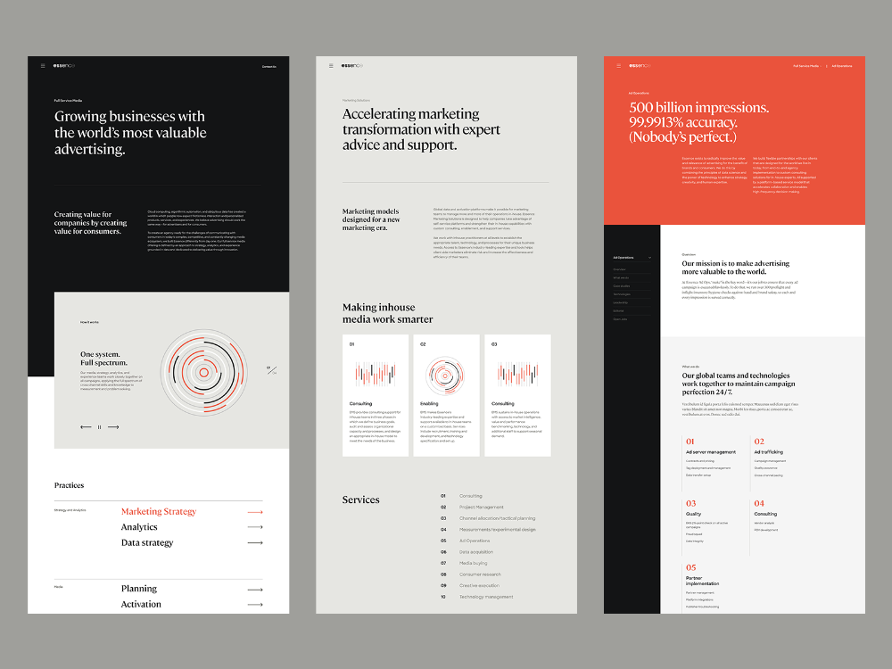 The design employs a minimalist and highly structured approach, utilizing ample white space to emphasize clarity and professionalism. The visual language is clean and modern, relying heavily on typography and clear sectioning to guide the user through complex services.