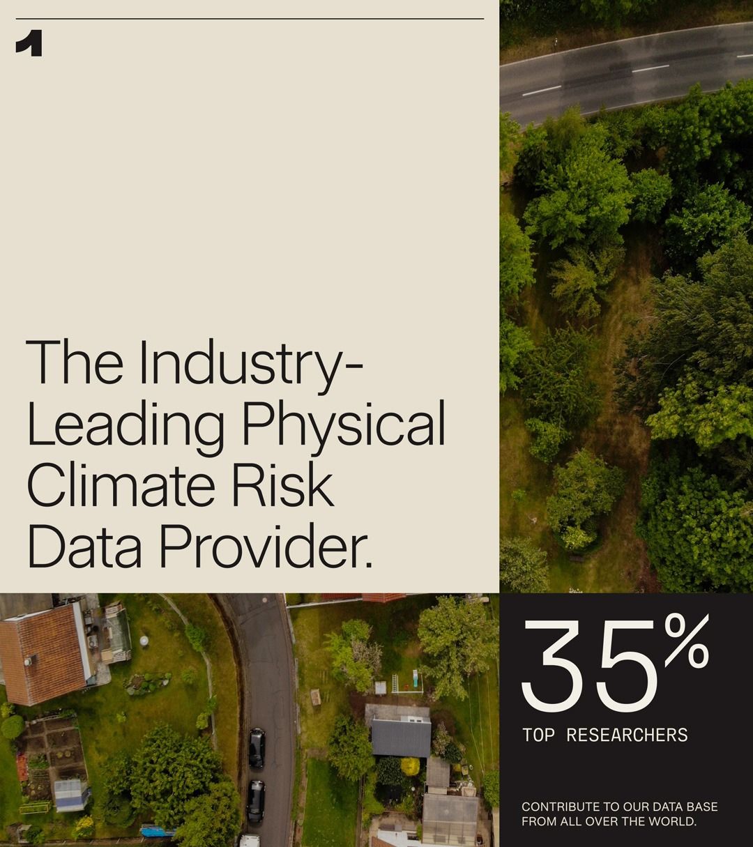 The image presents a clean, professional layout combining large blocks of white space with photographic imagery to convey expertise in climate risk data. The design is modern and corporate, using high-quality visuals alongside clear textual hierarchy to establish authority.