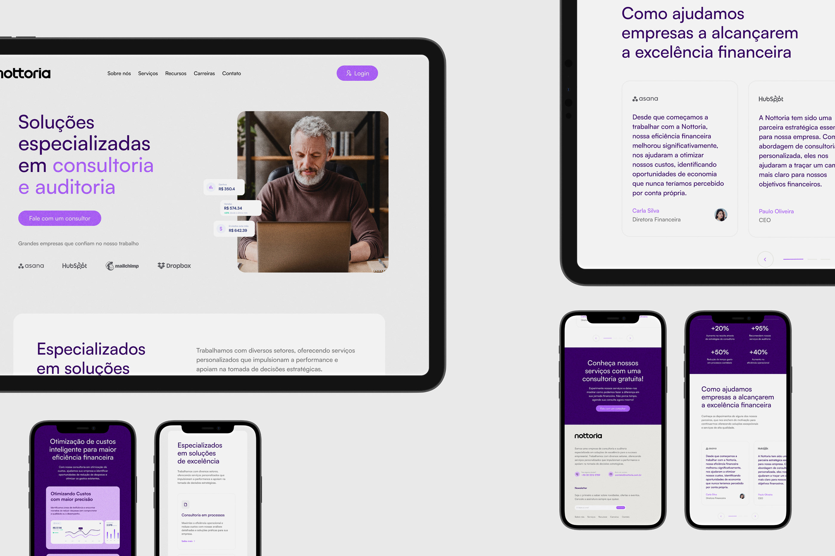 The image presents a clean, professional, and modern web or marketing page design, utilizing soft lighting and a muted color palette to convey trust and expertise. The layout is structured with clear sections, featuring high-quality photography of professionals collaborating to illustrate a service-based business.
