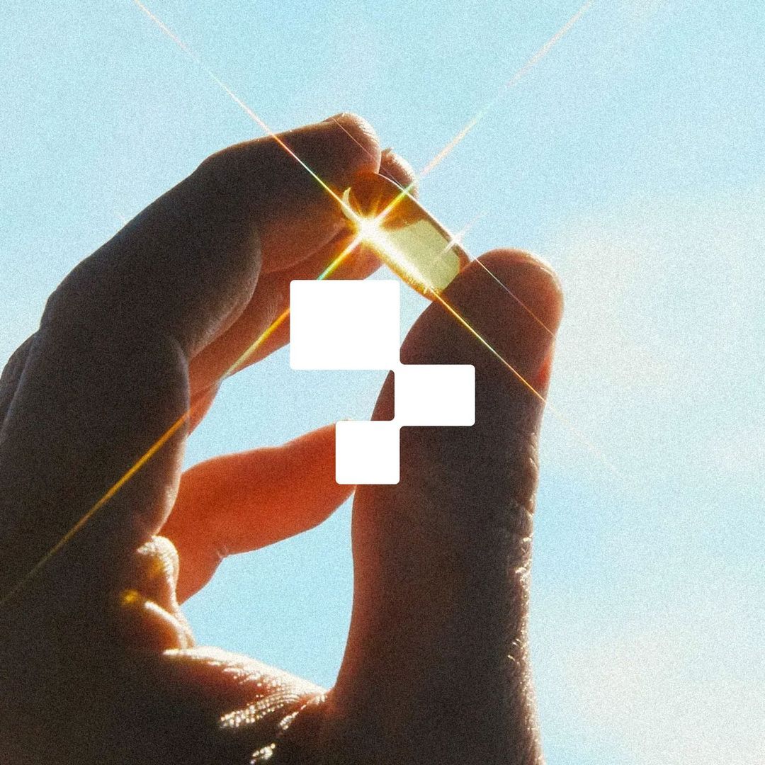 This image features a warm, high-contrast composition where a hand holds a luminous object against a bright sky background. The design emphasizes light, shadow, and a simple, minimalist internal graphic, creating an ethereal and focused mood.