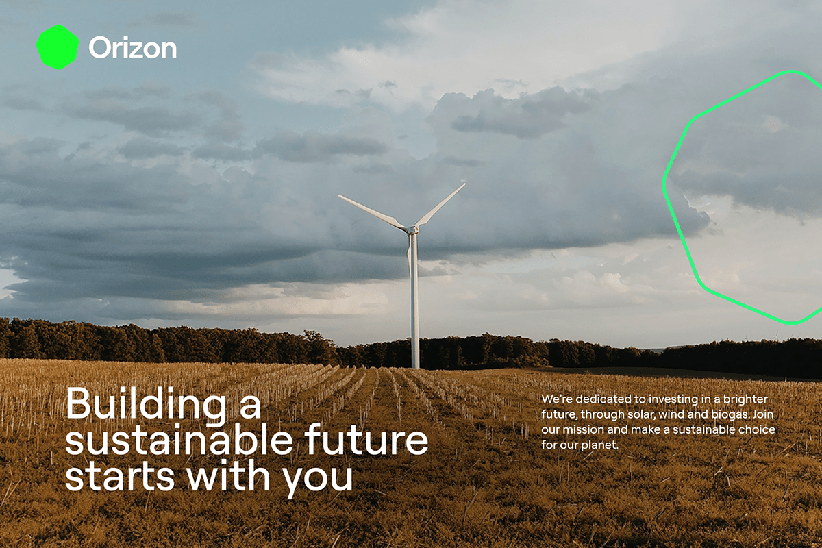 The image presents a clean, modern, and environmentally conscious visual narrative, using muted earth tones contrasted by the stark white of the wind turbine against a dramatic, cloudy sky. The design effectively communicates themes of sustainability and forward-thinking energy.