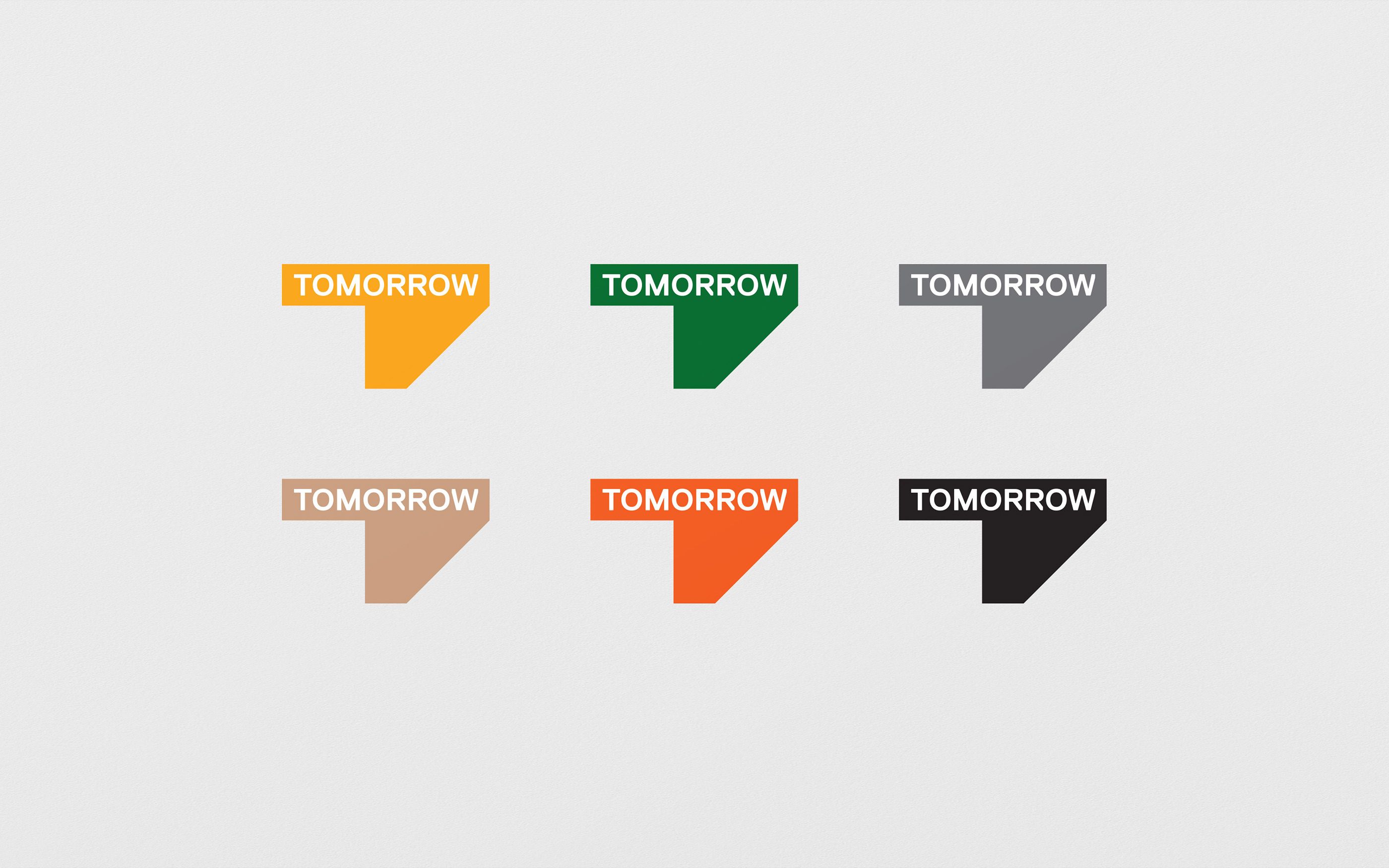 This image presents a minimalist, modular design featuring the word 'TOMORROW' repeated across various color blocks and geometric shapes. The visual language is clean, modern, and relies heavily on color variation to differentiate the elements while maintaining a cohesive structure.