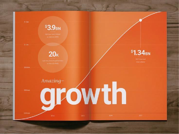 The design utilizes a clean, modern aesthetic with a strong emphasis on data visualization and growth representation. The layout is dominated by a bright orange background contrasted with white text and a sweeping white line graph, creating a dynamic yet professional feel.