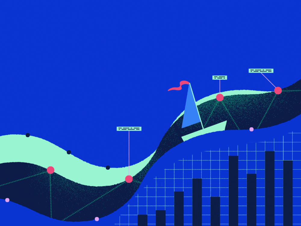 A vibrant data visualization dashboard featuring an upward trending graph with flowing organic curves and geometric elements. The design combines modern infographic aesthetics with a dynamic, energetic visual language that communicates growth and progress through layered visual metaphors.