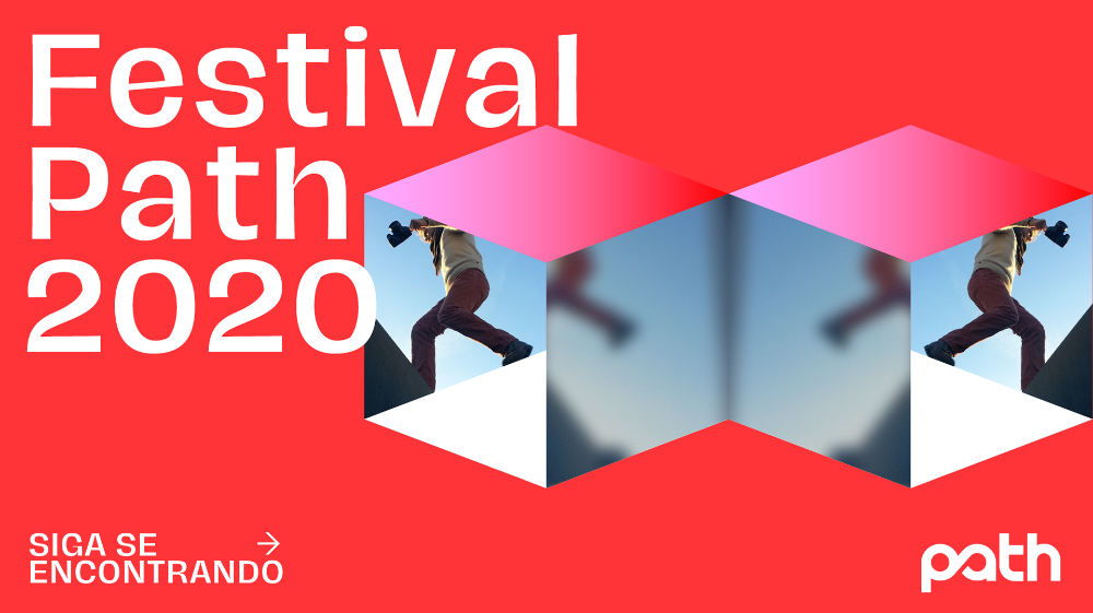 This design utilizes bold, overlapping geometric shapes to create a dynamic sense of depth and movement against a vibrant red background. The visual language is energetic and modern, effectively conveying the theme of a festival through abstract forms.