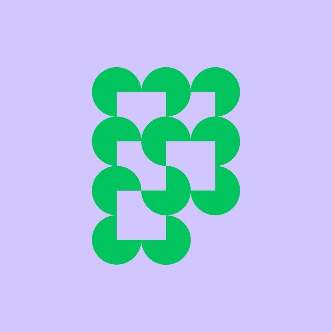 A geometric abstract composition featuring interlocking circles and squares in vibrant emerald green against a soft lavender background. The design employs a modular, tessellating pattern that creates a sense of interconnected harmony through repetition and symmetry.