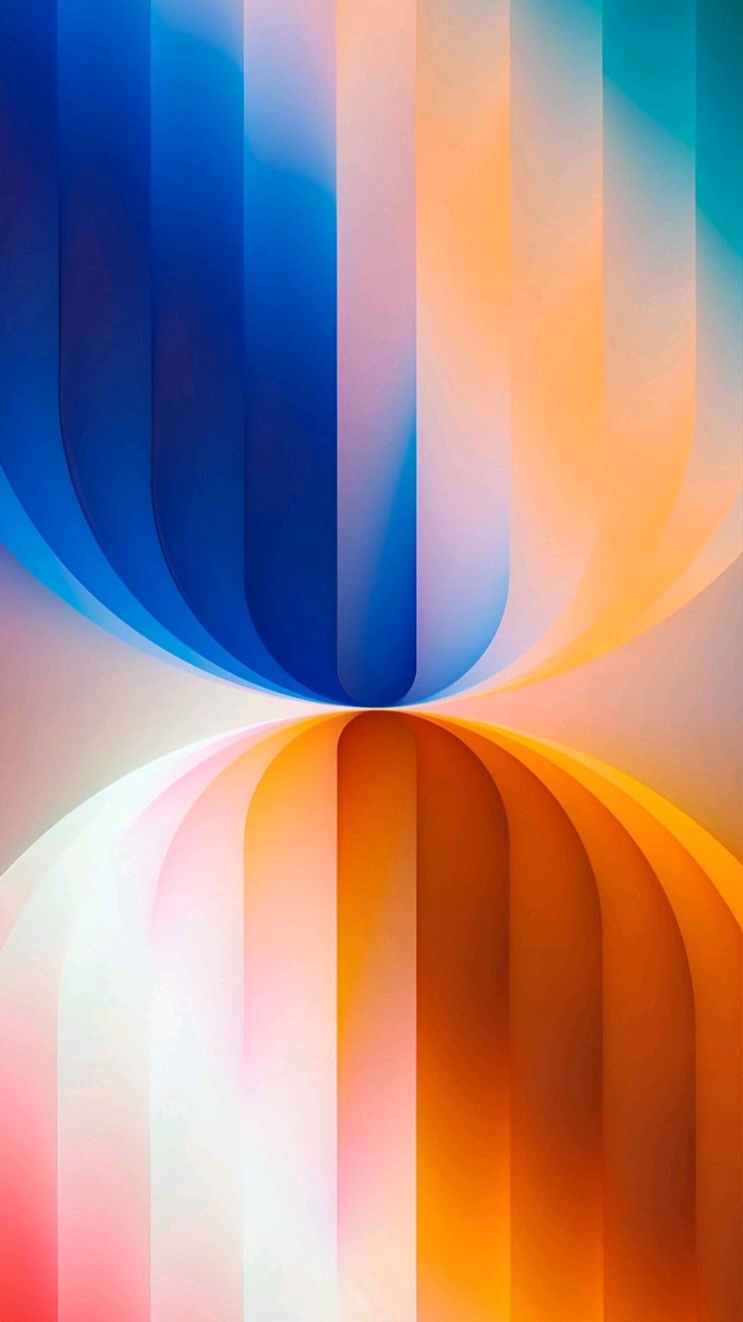 A vibrant abstract composition featuring symmetrical flowing gradients that meet at a central point, creating a dynamic interplay between cool blues and warm oranges. The design uses soft, blended color transitions and curved striping to evoke movement and balance, with a modern, polished aesthetic.