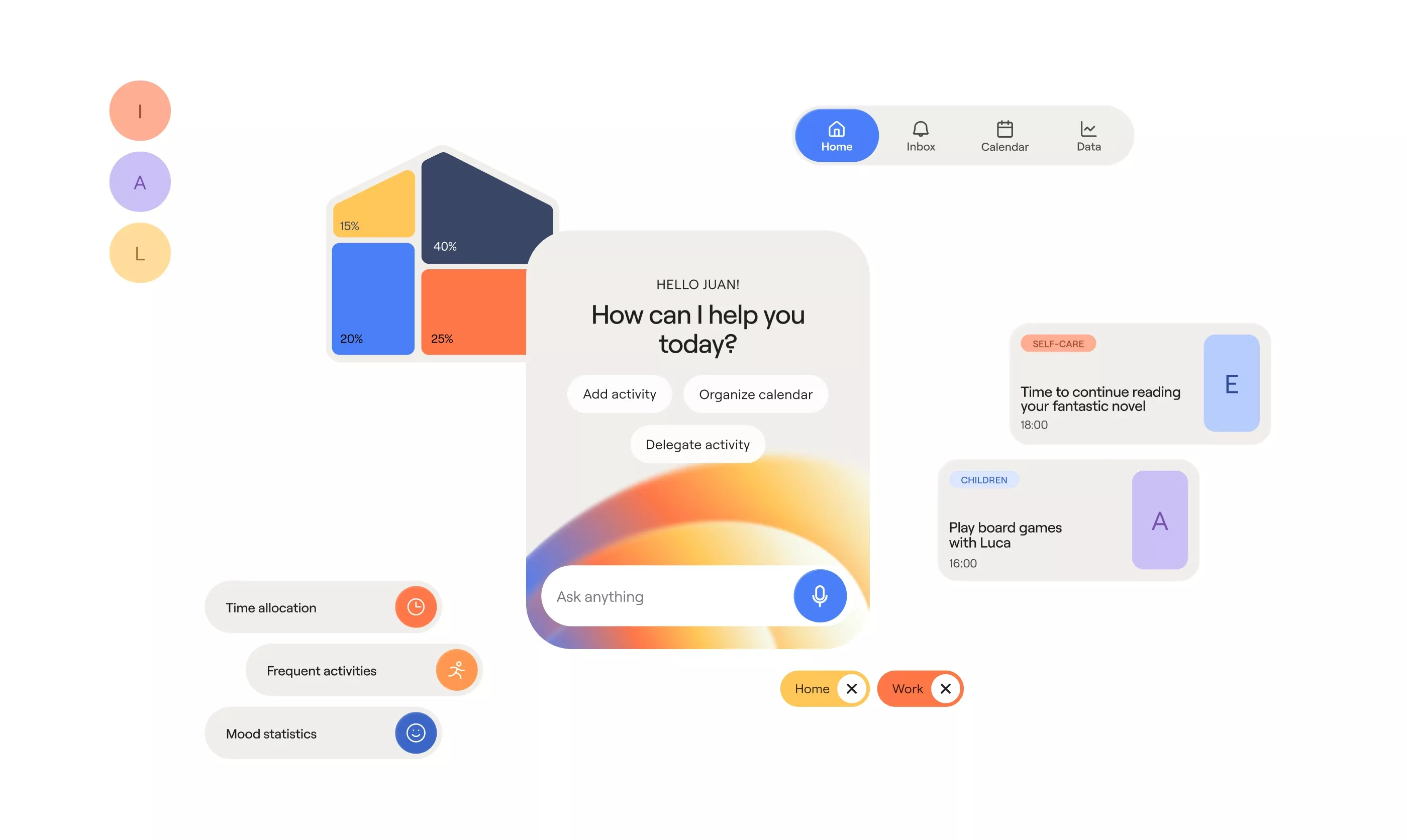 This interface features a clean, modern design utilizing soft gradients and geometric shapes to present data and prompts in an approachable manner. The visual language is friendly yet professional, balancing clear information hierarchy with a soft, inviting aesthetic.