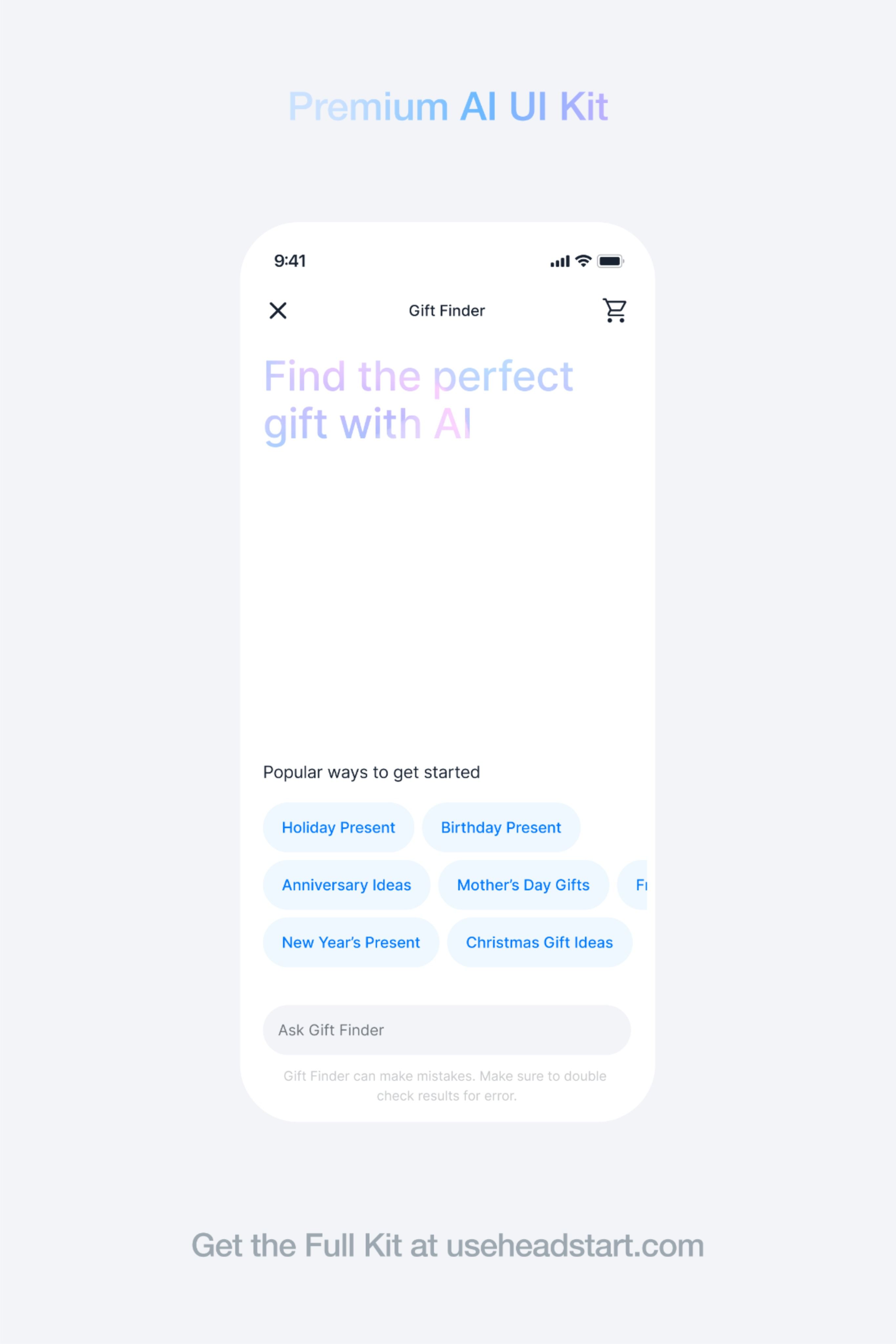 The image presents a clean, minimalist mobile UI mockup for a gift-finding application, characterized by ample white space and clear, functional typography. The design employs a light, airy aesthetic typical of modern digital product interfaces, focusing user attention on the core task.